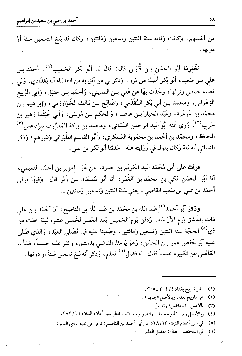 من أنفسهم وكانت وفاته سنة اثنتين وتسعين ومائتين وكان قد بلغ التسعين سنة أو دونها أخبرنا أبو الحسن بن قبيس قال قال لنا أبو بكر الخطيب (1) أحمد بن علي بن سعيد أبو بكر أصله من مرو وذكر لي من أثق به من العلماء أنه بغدادي ولي قضاء حمص ونزلها وحدث بها عن علي بن المديني وأحمد بن حنبل وأبي الربيع الزهراني ومحمد بن أبي بكر المقدمي وصالح بن مالك الخوارزمي وإبراهيم بن محمد بن عرعرة وعبد الجبار بن عاصم والحكم بن موسى وأبي خيثمة زهير بن حرب (2) روى عنه أبو عبد الرحمن النسائي ومحمد بن بركة المعروف ببرداعس (3) الحافظ ومحمد بن أحمد بن محموية العسكري وأبو القاسم الطبراني وغيرهم وذكر النسائي أنه ثقة وكان يقول في روايته عنه حدثنا أبو بكر بن علي قرأت على أبي محمد عبد الكريم بن حمزة عن عبد العزيز بن أحمد التميمي أنا أبو الحسن مكي بن محمد بن الغمر أنا أبو سليمان بن زبر قال وفيها توفي أحمد بن علي بن سعيد القاضي يعني سنة اثنتين وتسعين ومائتين وذكر أبو أحمد (4) عبد الله بن محمد بن عبد الله بن الناصح أن أحمد بن علي مات بدمشق يوم الأربعاء ودفن يوم الخميس بعد العصر لخمس عشرة ليلة خلت من ذي (5) الحجة سنة اثنتين وتسعين ومائتين وصلينا عليه في مصلى العيد والذي صلى عليه أبو حفص عمر بن الحسن وهو يومئذ القاضي بدمشق وكبر عليه خمسا فسألنا القاضي عن تكبيره خمسا فقال له فضل (6) العلم وذكر أنه بلغ تسعين سنة أو دونها