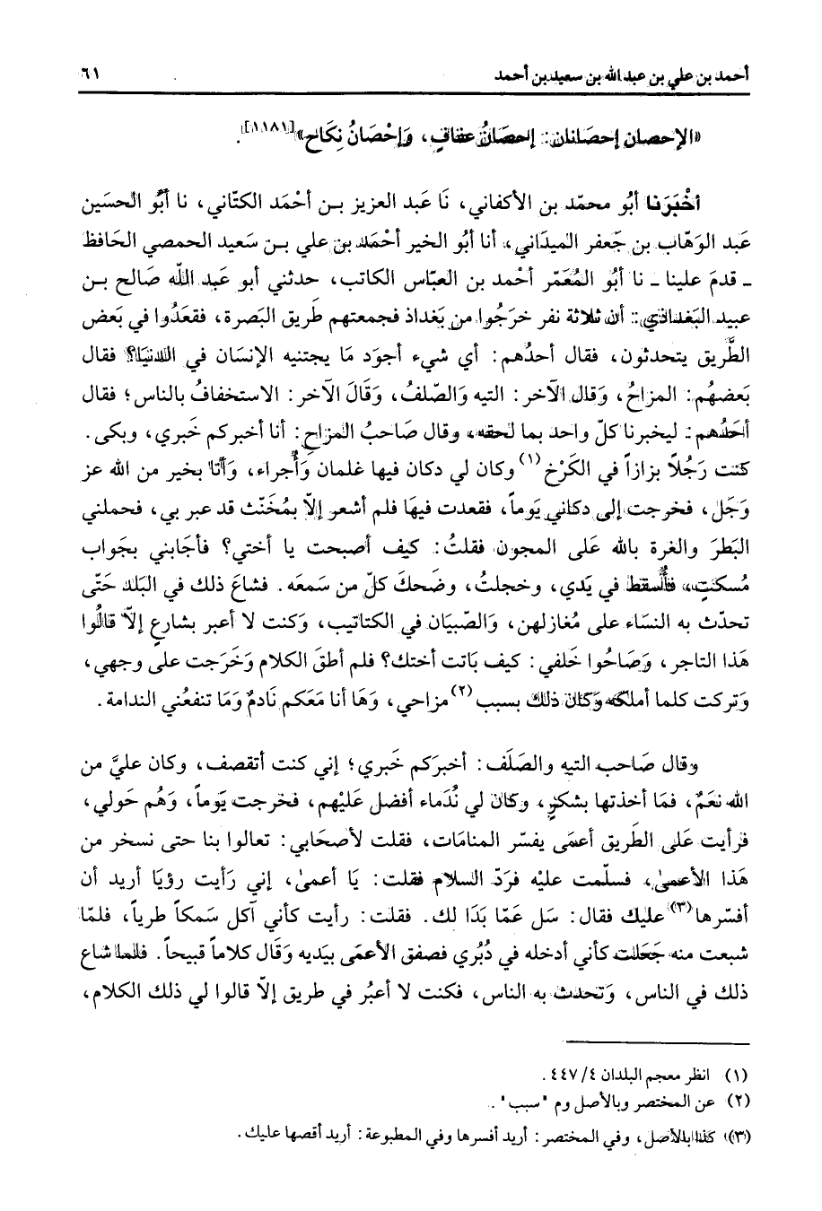[1181] أخبرنا أبو محمد بن الأكفاني نا عبد العزيز بن أحمد الكتاني نا أبو الحسين عبد الوهاب بن جعفر الميداني أنا أبو الخير أحمد بن علي بن سعيد الحمصي الحافظ قدم علينا نا أبو المعمر أحمد بن العباس الكاتب حدثني أبو عبد الله صالح بن عبيد البغداذي أن ثلاثة نفر خرجوا من بغداذ فجمعتهم طريق البصرة فقعدوا في بعض الطريق يتحدثون فقال أحدهم أي شئ أجود ما يجتنيه الإنسان في الدنيا فقال بعضهم المزاح وقال الآخر التيه والصلف وقال الآخر الاستخفاف بالناس فقال أحدهم ليخبرنا كل واحد بما لحقه وقال صاحب المزاح أنا أخبركم خبري وبكى كنت رجلا بزازا في الكرخ (1) وكان لي وكان فيها غلمان وأجراء وأنا بخير من الله عز وجل فخرجت إلى دكاني يوما فقعدت فيها فلم أشعر إلا بمخنث قد عبر بي فحملني البطر والغرة بالله على المجون فقلت كيف أصبحت يا أختي فأجابني بجواب مسكت فأسقط في يدي وخجلت وضحك كل من سمعه فشاع ذلك في البلد حتى تحدث به النساء على مغازلهن والصبيان في الكتاتيب وكنت لا أعبر بشارع إلا قالوا هذا التاجر وصاحوا خلفي كيف باتت أختك فلم أطق الكلام وخرجت على وجهي وتركت كلما أملكه وكان ذلك بسبب (2) مزاحي وها أنا معكم نادم وما تنفعني الندامة وقال صاحب التيه والصلف أخبركم خبري إني كنت أتقصف وكان علي من الله نعم فلما أخذتها بشكر وكان لي ندماء أفضل عليهم فخرجت يوما وهم حولي فرأيت على الطريق أعمى يفسر المنامات فقلت لأصحابي تعالوا بنا حتى نسخر من هذا الأعمى فسلمت عليه فرد السلام فقلت يا أعمى إني رأيت رؤيا أريد أن أفسرها (3) عليك فقال سل عما بدا لك فقلت رأيت كأني آكل سمكا طريا فلما شبعت منه جعلت كأني أدخله في دبري فصفق الأعمى بيديه وقال كلاما قبيحا فلما شاع ذلك في الناس وتحدث به الناس فكنت لا أعبر في طريق إلا قالوا لي ذلك الكلام