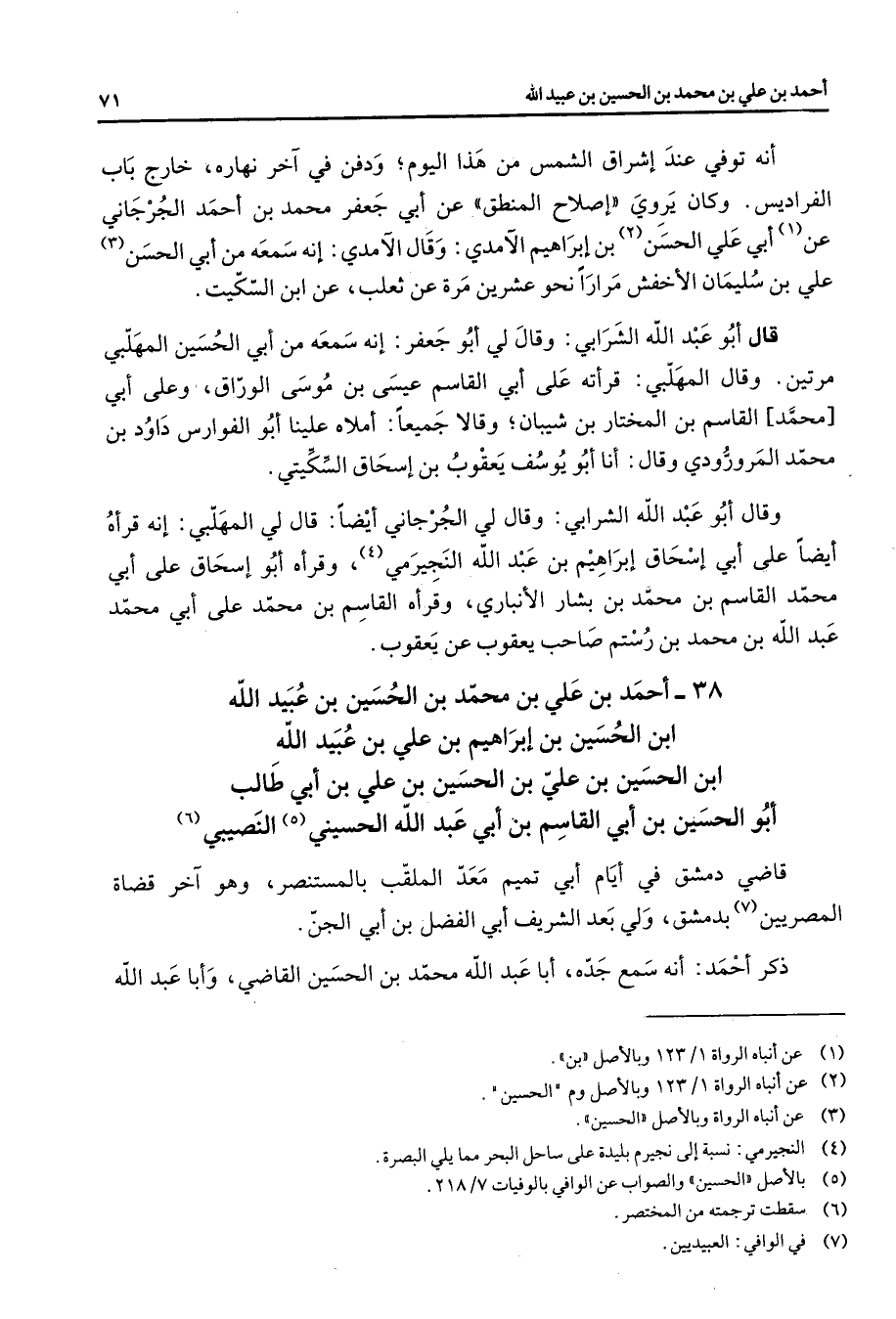 أنه توفي عند إشراق الشمس من هذا اليوم ودفن في آخر نهاره خارج باب الفراديس وكان يروي إصلاح المنطق عن أبي جعفر محمد بن أحمد الجرجاني عن (1) أبي علي الحسن (2) بن إبراهيم الآمدي وقال الآمدي إنه سمعه من أبي الحسن (3) علي بن سليمان الأخفش مرارا نحو عشرين مرة عن ثعلب عن ابن السكيت قال أبو عبد الله الشرابي وقال لي أبو جعفر إنه سمعه من أبي الحسين المهلبي مرتين وقال المهلبي قرأته على أبي القاسم عيسى بن موسى الوراق وعلى أبي محمد القاسم بن المختار بن شيبان وقالا جميعا أملاه علينا أبو الفوارس داود بن محمد المرورودي وقال أنا أبو يوسف يعقوب بن إسحاق السكيتي وقال أبو عبد الله الشرابي وقال لي الجرجاني أيضا قال لي المهلبي إنه قرأه أيضا على أبي إسحاق إبراهيم بن عبد الله النجيرمي (4) وقرأه أبو إسحاق على أبي محمد القاسم بن محمد بن بشار الأنباري وقرأه القاسم بن محمد على أبي محمد عبد الله بن محمد بن رستم صاحب يعقوب عن يعقوب 38 - أحمد بن علي بن محمد بن الحسين بن عبيد الله ابن الحسين بن إبراهيم بن علي بن عبيد الله ابن الحسين بن علي بن الحسين بن علي بن أبي طالب أبو الحسين بن أبي القاسم بن أبي عبد الله الحسيني (5) النصيبي (6) قاضي دمشق في أيام أبي تميم معد الملقب بالمستنصر وهو آخر قضاة المصريين (7) بدمشق ولي بعد الشريف أبي الفضل بن أبي الجن ذكر أحمد أنه سمع جده أبا عبد الله محمد بن الحسين القاضي وأبا عبد الله