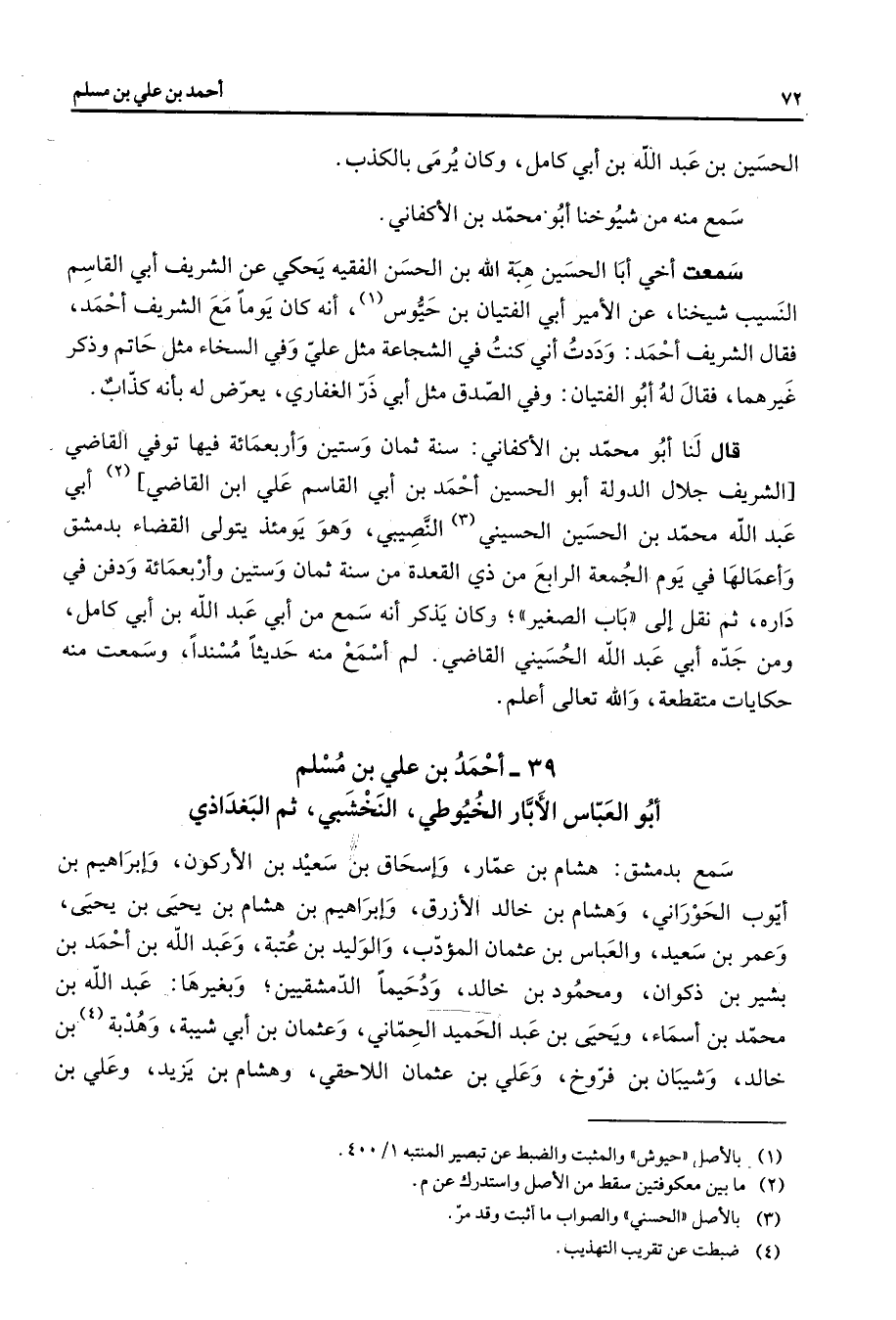 الحسين بن عبد الله بن أبي كامل وكان يرمى بالكذب سمع منه من شيوخنا أبو محمد بن الأكفاني سمعت أخي أبا الحسين هبة الله بن الحسن الفقيه يحكي عن الشريف أبي القاسم النسيب شيخنا عن الأمير أبي الفتيان بن حيوس (1) أنه كان يوما مع الشريف أحمد فقال الشريف أحمد وددت أني كنت في الشجاعة مثل علي وفي السخاء مثل حاتم وذكر غيرهما فقال له أبو الفتيان وفي الصدق مثل أبي ذر الغفاري يعرض له بأنه كذاب قال لنا أبو محمد بن الأكفاني سنة ثمان وستين وأربعمائة فيها توفي القاضي [الشريف جلال الدولة أبو الحسين أحمد بن أبي القاسم علي ابن القاضي] (2) أبي عبد الله محمد بن الحسين الحسيني (3) النصيبي وهو يومئذ يتولى القضاء بدمشق وأعمالها في يوم الجمعة الرابع من ذي القعدة من سنة ثمان وستين وأربعمائة ودفن في داره ثم نقل إلى باب الصغير وكان يذكر أنه سمع من أبي عبد الله بن أبي كامل ومن جده أبي عبد الله الحسيني القاضي لم أسمع منه حديثا مسندا وسمعت منه حكايات متقطعة والله تعالى أعلم 39 - أحمد بن علي بن مسلم أبو العباس الأبار الخيوطي النخشبي ثم البغداذي سمع بدمشق هشام بن عمار وإسحاق بن سعيد بن الأركون وإبراهيم بن أيوب الحوراني وهشام بن خالد الأزرق وإبراهيم بن هشام بن يحيى بن يحيى وعمر بن سعيد والعباس بن عثمان المؤدب والوليد بن عبتة وعبد الله بن أحمد بن بشير بن ذكوان ومحمود بن خالد ودحيما الدمشقيين وبغيرها عبد الله بن محمد بن اسماء ويحيى بن عبد الحميد الحماني وعثمان بن أبي شيبة وهدبة (4) بن خالد وشيبان بن فروخ وعلي بن عثمان اللاحقي وهشام بن يزيد وعلي بن
