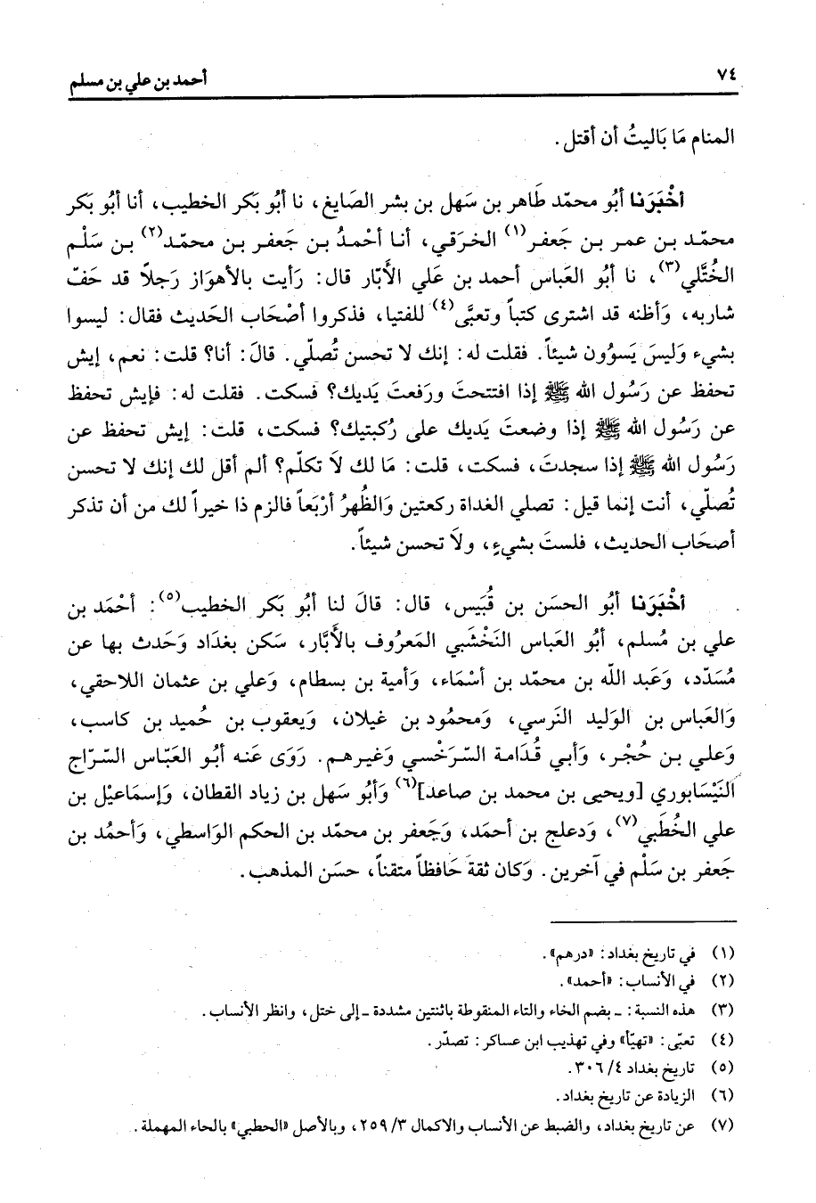(7) عن تاريخ بغداد والضبط عن الانساب والاكمال 3 / 259، وبالاصل " الحطبي " بالحاء المهلمة