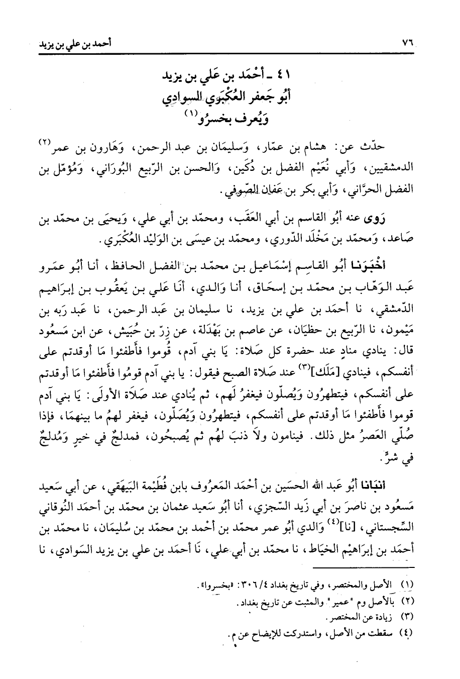 41 - أحمد بن علي بن يزيد أبو جعفر العكبري السوادي ويعرف بخسرو (1) حدث عن هشام بن عمار وسليمان بن عبد الرحمن وهارون بن عمر (2) الدمشقيين وأبي نعيم الفضل بن دكين والحسن بن الربيع البوراني ومؤمل بن الفضل الحراني وأبي بكر بن عفان الصوفي روى عنه أبو القاسم بن أبي العقب ومحمد بن أبي علي ويحيى بن محمد بن صاعد ومحمد بن مخلد الدوري ومحمد بن عيسى بن الوليد العكبري أخبرنا أبو القاسم إسماعيل بن محمد بن الفضل الحافظ أنا أبو عمرو عبد الوهاب بن محمد بن إسحاق أنا والدي أنا علي بن يعقوب بن إبراهيم الدمشقي نا أحمد بن علي بن يزيد نا سليمان بن عبد الرحمن نا عبد ربه بن ميمون نا الربيع بن حظيان عن عاصم بن بهدلة عن زر بن حبيش عن ابن مسعود قال ينادي مناد عند حضرة كل صلاة يا بني آدم قوموا فأطفئوا ما أوقدتم على أنفسكم فينادي [ملك] (3) عند صلاة الصبح فيقول يا بني آدم قوموا فأطفئوا ما أوقدتم على أنفسكم فيتطهرون ويصلون فيغفر لهم ثم ينادي عند صلاة الأولى يا بني آدم قوموا فأطفئوا ما أوقدتم على أنفسكم فيتطهرون ويصلون فيغفر لهم ما بينهما فإذا صلي العصر مثل ذلك فينامون ولا ذنب لهم ثم يصبحون فمدلج في خير ومدلج في شر أنبأنا أبو عبد الله الحسين بن أحمد المعروف بابن فطيمة البيهقي عن أبي سعيد مسعود بن ناصر بن أبي زيد السجزي أنا أبو سعيد عثمان بن محمد بن أحمد النوقاني السجستاني [نا] (4) والدي أبو عمر محمد بن أحمد بن محمد بن سليمان نا محمد بن أحمد بن إبراهيم الخياط نا محمد بن أبي علي نا أحمد بن علي بن يزيد السوادي نا