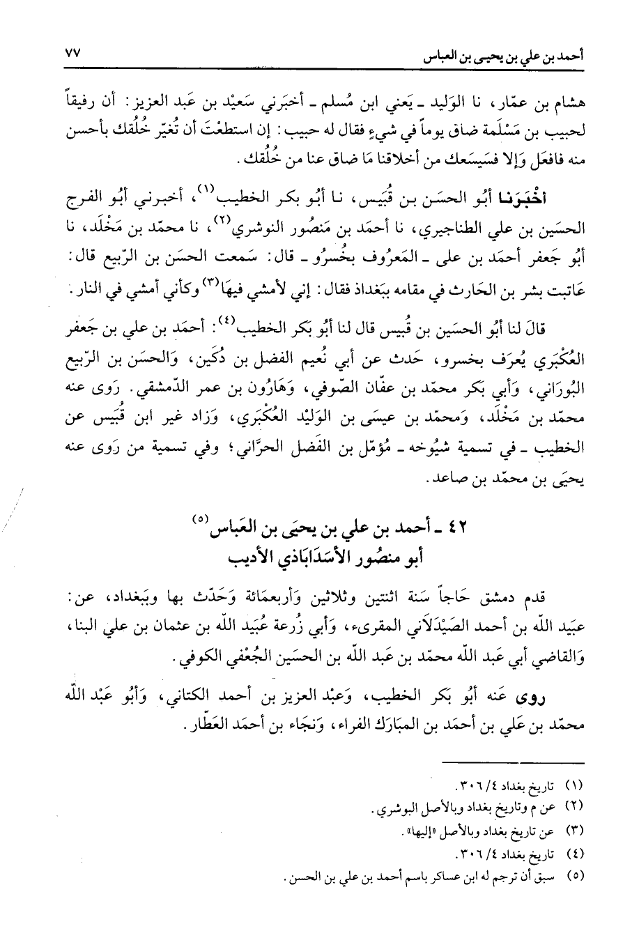42 - أحمد بن علي بن يحيى بن العباس (5) أبو منصور الأسداباذي الأديب قدم دمشق حاجا سنة اثنتين وثلاثين وأربعمائة وحدث بها وببغداد عن عبيد الله بن أحمد الصيدلاني المقرئ وأبي زرعة عبيد الله بن عثمان بن علي البنا والقاضي أبي عبد الله محمد بن عبد الله بن الحسين الجعفي الكوفي روى عنه أبو بكر الخطيب وعبد العزيز بن أحمد الكتاني وأبو عبد الله محمد بن علي بن أحمد بن المبارك الفراء ونجاء بن أحمد العطار (1) تاريخ بغداد 4 / 306
