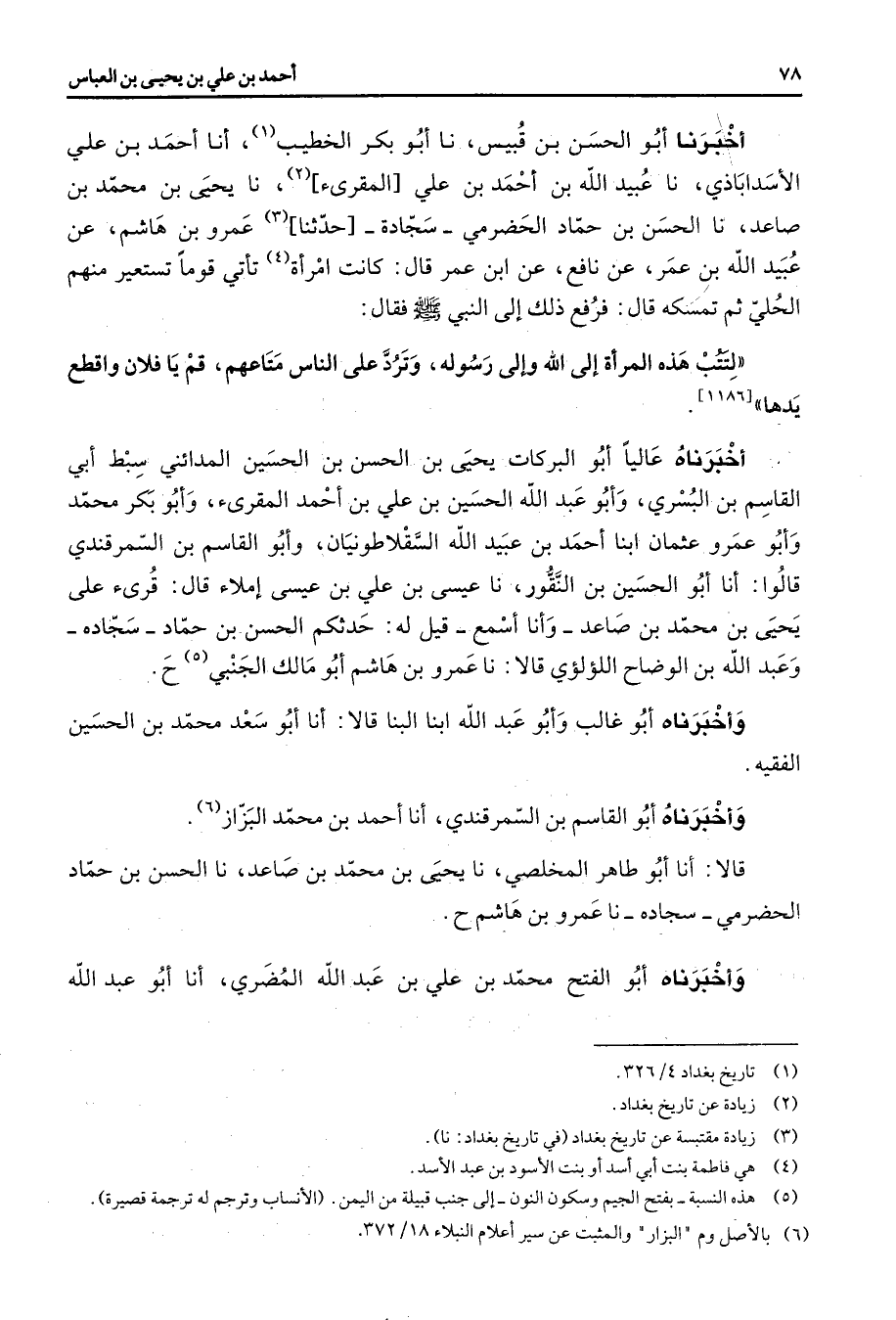 أخبرنا أبو الحسن بن قبيس نا أبو بكر الخطيب (1) أنا أحمد بن علي الأسداباذي نا عبيد الله بن أحمد بن علي [المقرئ] (2) نا يحيى بن محمد بن صاعد نا الحسن بن حماد الحضرمي سجادة [حدثنا] (3) عمرو بن هشام عن عبيد الله بن عمر عن نافع عن ابن عمر قال كانت امرأة (4) تأتي قوما تستعير منهم الحلي ثم تمسكه قال فرفع ذلك إلى النبي (صلى الله عليه وسلم) فقال ولتتب هذه المرأة إلى الله وإلى رسوله وترد على الناس متاعهم قم يا فلان واقطع يدها
