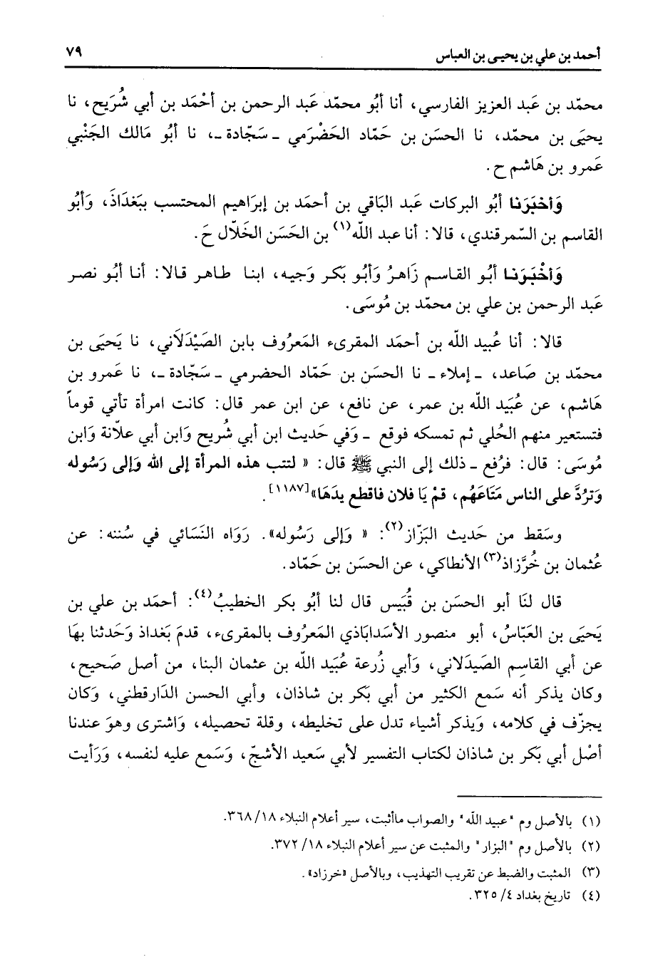محمد بن عبد العزيز الفارسي أنا أبو محمد عبد الرحمن بن أحمد بن أبي شريح نا يحيى بن محمد نا الحسن بن حماد الحضرمي سجادة نا أبو مالك الجنبي عمرو بن هاشم وأخبرنا أبو البركات عبد الباقي بن أحمد بن إبراهيم المحتسب ببغداذ وأبو القاسم بن السمرقندي قالا أنا عبد الله (1) بن الحسن الخلال وأخبرنا أبو القاسم زاهر وأبو بكر وجيه ابنا طاهر قالا أنا أبو نصر عبد الرحمن بن علي بن محمد بن موسى قالا أنا عبيد الله بن أحمد المقرئ المعروف بابن الصيدلاني نا يحيى بن محمد بن صاعد إملاء نا الحسن بن حماد الحضرمي سجادة نا عمرو بن هاشم عن عبيد الله بن عمر عن نافع عن ابن عمر قال كانت امرأة تأتي قوما فتستعير منهم الحلي ثم تمسكه فوقع وفي حديث ابن أبي شريح وابن أبي علانة وابن موسى قال فرفع ذلك إلى النبي (صلى الله عليه وسلم) قال لتتب هذه المرأة إلى الله وإلى رسوله وترد على الناس متاعهم قم يا فلان فاقطع يدها