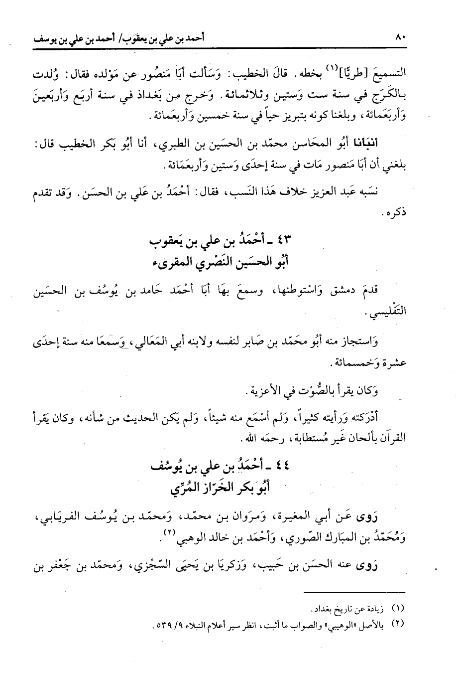 44 - أحمد بن علي بن يوسف أبو بكر الخراز المري روى عن ابي المغيرة ومروان بن محمد ومحمد بن يوسف الفريابي ومحمد بن المبارك الصوري وأحمد بن خالد الوهبي روى عنه الحسن بن حبيب وزكريا بن يحيى السجزي ومحمد بن جعفر بن