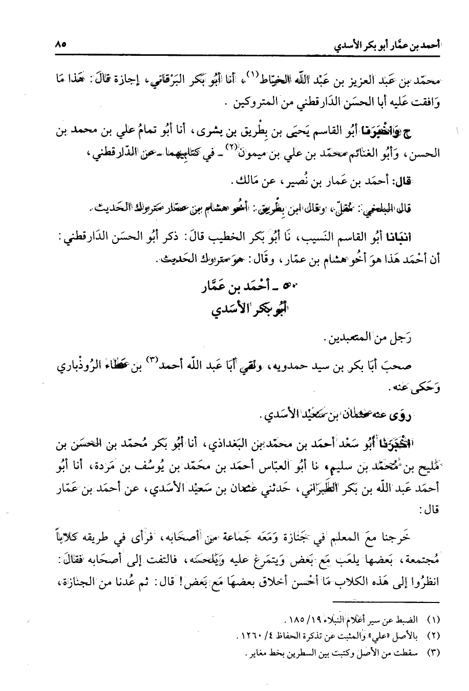 محمد بن عبد العزيز بن عبد الله الخياط أنا أبو بكر البرقاني إجازة قال هذا ما وافقت عليه أبا الحسن الدارقطني من المتروكين ح وأخبرنا أبو القاسم يحيى بن بطريق بن بشرى أنا أبو تمام علي بن محمد بن الحسن وأبو الغنائم محمد بن علي بن ميمون في كتابيهما عن الدارقطني قال أحمد بن عمار بن نصير عن مالك قال البلخي مقل وقال ابن بطريق أخو هشام بن عمار متروك الحديث أنبأنا أبو القاسم النسيب نا أبو بكر الخطيب قال ذكر أبو الحسن الدارقطني أن أحمد هذا هو أخو هشام بن عمار وقال هو متروك الحديث