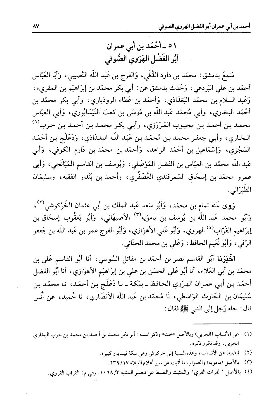 51 - أحمد بن أبي عمران أبو الفضل الهروي الصوفي سمع بدمشق محمد بن داود الدقي والفرج بن عبد الله النصيبي وأبا العباس أحمد بن علي البردعي وحدث بدمشق عن أبي بكر محمد بن إبراهيم بن المقرئ وعبد السلام بن محمد البغداذي وأحمد بن عطاء الروذباري وأبي بكر محمد بن أحمد البخاري وأبي محمد عبد الله بن موسى بن كعب النيسابوري وأبي العباي محمد بن أحمد بن محبوب المروزي وأبي بكر محمد بن أحمد بن حرب البخاري وأبي جعفر محمد بن محمد بن عبد الله البغداذي ودعلج بن أحمد السجزي وإسماعيل بن أحمد الزاهد وأحمد بن محمد بن دارم الكوفي وأبي عبد الله محمد بن العباس بن الفضل الموصلي ويوسف بن القاسم الميانجي وأبي عمرو محمد بن إسحاق السمرقندي العصفري وأحمد بن بندار الفقيه وسليمان الطبراني روى عنه تمام بن محمد وأبو سعد عبد الملك بن أبي عثمان الخركوشي وأبو محمد عبد الله بن يوسف بن بامويه الأصبهاني وأبو يعقوب إسحاق بن إبراهيم القراب الهروي وأبو علي الأهوازي وأبو الفرج عمر بن عبد الله بن جعفر الرقي وأبو نعيم الحافظ وعلي بن محمد الحنائي أخبرنا أبو القاسم نصر بن أحمد بن مقاتل السوسي أنا أبو القاسم علي بن محمد بن أبي العلاء أنا أبو علي الحسن بن علي بن إبراهيم الأهوازي أنا أبو الفضل أحمد بن أبي عمران الهروي الحافظ بمكة نا دعلج بن أحمد نا محمد بن سليمان بن الحارث الواسطي نا محمد بن عبد الله الأنصاري نا حميد عن أنس قال جاء رجل إلى النبي (صلى الله عليه وسلم) فقال