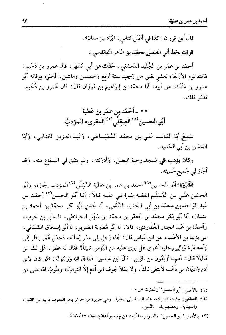 قال ابن مروان كذا في أصل كتابي برد بن سنان قرأت بخط أبي الفضل محمد بن طاهر المقدسي أحمد بن عمر بن الجليد الدمشقي حدث عن أبي مسهر قال عمرو بن دحيم مات يوم الأربعاء لعشر بقين من رجب سنة أربع وخمسين ومائتين أخبره بوفاته أبو عمرو بن مندة عن أبيه أنا محمد بن إبراهيم بن مروان قال قال عمرو بن دحيم فذكر ذلك 55 أحمد بن عمر بن عطية أبو الحسين الصقلي المقرئ المؤدب سمع أبا القاسم علي بن محمد السميساطي وعبد العزيز الكتاني وأبا الحسن بن أبي الحديد وكان يؤدب في مسجد رحبة البصل وأدركته ولم يتفق لي السماع منه وقد أجاز لي جميع حديثه أخبرنا أبو الحسين (1) أحمد بن عمر بن عطية السقلي (2) المؤدب إجازة وأبو الحسن علي بن المسلم الفقيه بقراءتي عليه قالا أنا أبو الحسن (3) أحمد بن عبد الواحد بن محمد بن أبي الحديد السلمي أنا جدي أبو بكر محمد بن أحمد بن عثمان أنا أبو بكر محمد بن جعفر بن محمد بن سهل الخرائطي نا علي بن حرب وأحمد بن عبد الجبار العطاردي قالا نا أبو معاوية الضرير نا أبو إسحاق الشيباني عن يزيد بن الأصم عن ابن عباس قال جاء رجل إلى عمر يسأله فجعل عمر ينظر إلى رأسه مرة وإلى رجليه أخرى هل يرى عليه من البؤس شيئا فقال له عمر هل لك من مال قال نعم أربعون من الإبل قال ابن عباس صدق الله ورسوله لو كان لابن آدم واديان من ذهب لابتغى ثالثا ولا يملأ جوف ابن آدم إلا التراب ويتوب الله على من