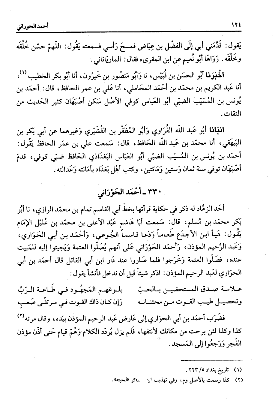 330 - أحمد الحوراني أحد الزهاد له ذكر في حكاية قرأتها بخط أبي القاسم تمام بن محمد الرازي نا أبو بكر محمد بن مسلم قال سمعت أبا هاشم عبد الأعلى بن محمد بن عليل الإمام يقول هيأ ابن الأجدع طعاما ودعا قاسما الجوعي وأحمد بن أبي الحواري وعبد الرحيم المؤذن وأحمد الحوراني على أنهم يصلوا العتمة ويجيئوا إليه للمبيت عنده فصلوا العتمة وخرجوا فلما صاروا عند دار ابن أبي القاتل قال أحمد بن أبي الحواري لعبد الرحيم المؤذن اذكر شيئا قبل أن ندخل فأنشأ يقول علامة صدق المستحضين بالحب * بلوغهم المجهود في طاعة الرب وتحصيل طيب القوت من محتنانه * وإن كان ذاك القوت في مرتقي صعب * فضرب أحمد بن أبي الحواري إلى عارض عبد الرحيم المؤذن بيده وقال مرته كذا وكذا لئن برحت من مكانك لأ نتفها فلم يزل يردد الكلام وهم قيام حتى أذن مؤذن الفجر ورجعوا إلى المسجد