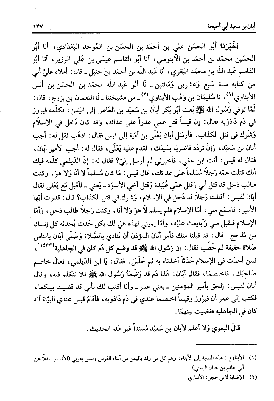 أخبرنا أبو الحسن علي بن أحمد بن الحسن بن الموحد البغداذي أنا أبو الحسين محمد بن أحمد بن الآبنوسي أنا أبو القاسم عيسى بن علي الوزير أنا أبو القاسم عبد الله بن محمد البغوي أنا عبد الله بن أحمد بن حنبل قال أملاه علي أبي من كتابه سنة سبع وعشرين ومائتين نا أبو عبد الله محمد بن الحسن بن أنس الأبناوي (1) نا سليمان بن وهب الأبناوي (2) من مشيختنا نا النعمان بن برزخ قال لما توفي رسول الله (صلى الله عليه وسلم) بعث أبو بكر أبان بن سعيد بن العاص إلى اليمن فكلمه فيروز في دم داذويه فقال إن قيسا قتل عمي غدرا على عدائه وقد كان دخل في الإسلام وشرك في قتل الكذاب فأرسل أبان يعلى بن أمية إلى قيس فقال اذهب فقل له أجب أبان بن سعيد وإن تردد فاضربه بسيفك فقدم عليه يعلى فقال له أجب الأمير أبان فقال له قيس أنت ابن عمي فأخبرني لم أرسل إلي فقال له إن الديلمي كلمه فيك أنك قتلت عمه رجلا مسلما على عدائك قال قيس ما كان مسلما لا أنا ولا هو وكنت طالب ذحل قد قتل أبي وقتل عمي عبيدة وقتل أخي الأسود يعني فأقبل مع يعلى فقال أبان لقيس أقتلت رجلا قد دخل في الإسلام وشرك في قتل الكذاب قال قدرت أيها الأمير فاسمع مني أما الإسلام فلم يسلم لا هو ولا أنا وكنت رجلا طالب ذحل وأما الإسلام فتقبل مني وأبايعك عليه وأما يميني فهذه هي لك بكل حدث يحدثه كل إنسان من مذحج قال قد قبلنا منك فأمر أبان المؤذن أن ينادي بالصلاة وصلى أبان بالناس صلاة خفيفة ثم خطب فقال إن رسول الله (صلى الله عليه وسلم) قد وضع كل دم كان في الجاهلية فمن أحدث في الإسلام حدثا أخذناه به ثم جلس فقال يا ابن الديلمي تعال خاصم صاحبك فاختصما فقال أبان هذا دم قد وضعه رسول الله (صلى الله عليه وسلم) فلا نتكلم فيه وقال أبان لقيس إلحق بأمير المؤمنين يعني عمر وأنا أكتب لك بأني قد قضيت بينكما فكتب إلى عمر أن فيروز وقيسا اختصما عندي في دم داوذيه فأقام قيس عندي البينة أنه كان في الجاهلية فقضيت بينهما قال البغوي ولا أعلم لأبان بن سعيد مسندا غير هذا الحديث