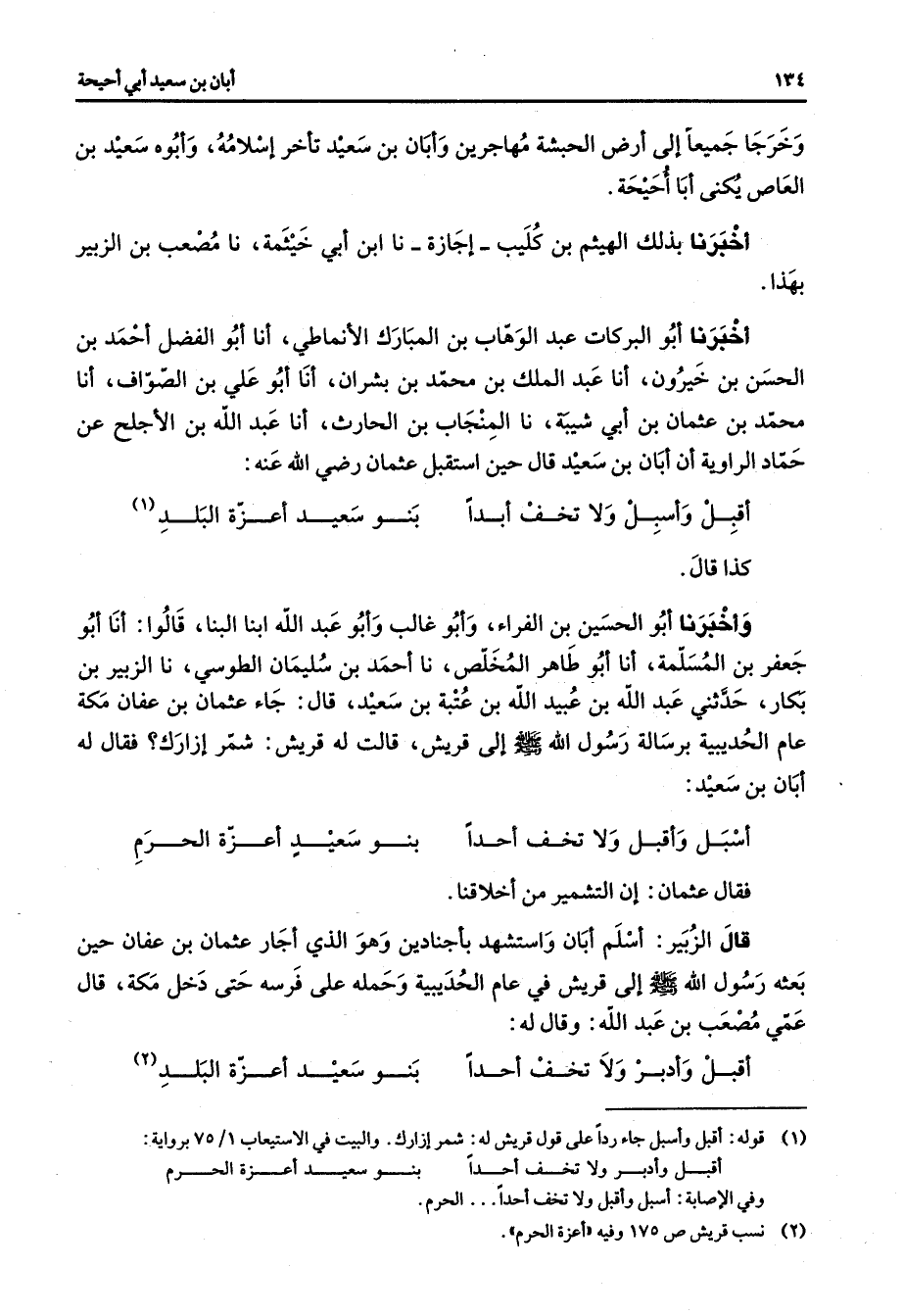 وخرجا جميعا إلى أرض الحبشة مهاجرين وأبان بن سعيد تأخر إسلامه وأبوه سعيد بن العاص يكنى أبا أحيحة أخبرنا بذلك الهيثم بن كليب إجازة نا ابن أبي خيثمة نا مصعب بن الزبير بهذا أخبرنا أبو البركات عبد الوهاب بن المبارك الأنماطي أنا أبو الفضل أحمد بن الحسن بن خيرون أنا عبد الملك بن محمد بن بشران أنا أبو علي بن الصواف أنا محمد بن عثمان بن أبي شيبة نا المنجاب بن الحارث أنا عبد الله بن الأجلح عن حماد الرواية أن أبان بن سعيد قال حين استقبل عثمان Bهـ * أقبل وأسبل ولا تخف أبدا * بنو سعيد أعزة البلد (1) * كذا قال وأخبرنا أبو الحسين بن الفراء وأبو غالب وأبو عبد الله ابنا البنا قالوا أنا أبو جعفر بن المسلمة أنا أبو طاهر المخلص نا أحمد بن سليمان الطوسي نا الزبير بن بكار حدثني عبد الله بن عبيد الله بن عتبة بن سعيد قال جاء عثمان بن عفان مكة عام الحديبية برسالة رسول الله (صلى الله عليه وسلم) إلى قر يش قالت له قريش شمر إزارك فقال له أبان بن سعيد * أسبل وأقبل ولا تخف أحدا * بنو سعيد أعزة الحرم * فقال عثمان إن التشمير من أخلاقنا قال الزبير أسلم أبان واستشهد بأجنادين وهو الذي أجار عثمان بن عفان حين بعثه رسول الله (صلى الله عليه وسلم) إلى قريش في عام الحديبية وحمله على فرسه حتى دخل مكة قال عمي مصعب بن عبد الله وقال له أقبل وأدبر ولا تخف أحدا * بنو سعيد أعزه البلد (2)
