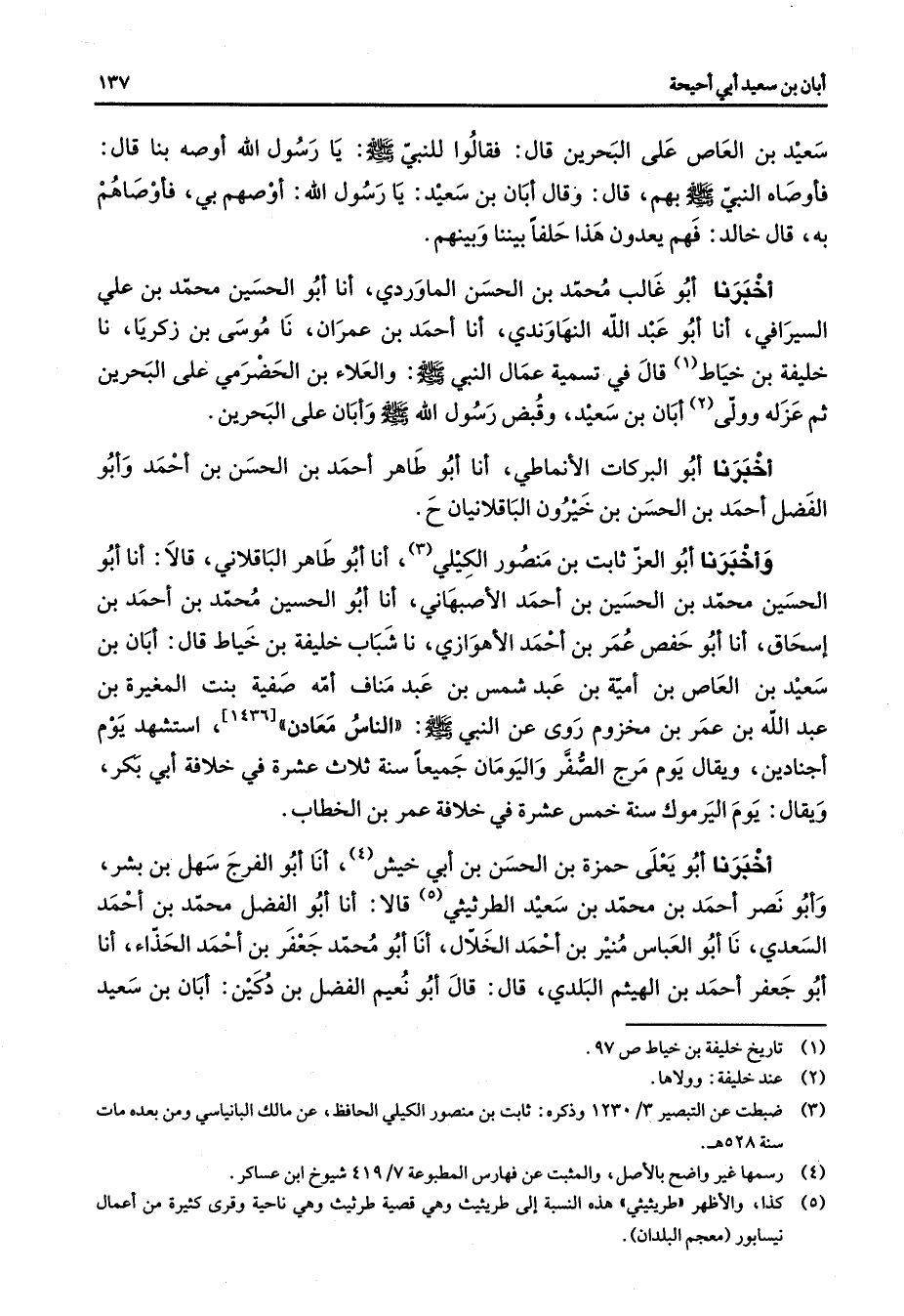 سعيد بن العاص على البحرين قال فقالوا للنبي (صلى الله عليه وسلم) يا رسول الله أوصه بنا قال فأوصاه النبي (صلى الله عليه وسلم) بهم قال وقال أبان بن سعيد يا رسول الله أوصهم بي فأوصاهم به قال خالد فهم يعدون هذا حلفا بيننا وبينهم أخبرنا أبو غالب محمد بن الحسن الماوردي أنا أبو الحسين محمد بن علي السيرافي أنا أبو عبد الله النهاوندي أنا أحمد بن عمران نا موسى بن زكريا نا خليفة بن خياط (1) قال في تسمية عمال النبي (صلى الله عليه وسلم) والعلاء بن الحضرمي على البحرين ثم عزله وولى (2) أبان بن سعيد وقبض رسول الله (صلى الله عليه وسلم) وأبان على البحرين أخبرنا أبو البركات الأنماطي أنا أبو طاهر أحمد بن الحسن بن أحمد وأبو الفضل أحمد بن الحسن بن خيرون الباقلانيان وأخبرنا أبو العز ثابت بن منصور الكيلي (3) أنا أبو طاهر الباقلاني قالا أنا أبو الحسين محمد بن الحسين بن أحمد الأصبهاني أنا أبو الحسين محمد بن أحمد بن إسحاق أنا أبو حفص عمر بن أحمد الأهوازي نا شباب خليفة بن خياط قال أبان بن سعيد بن العاص بن أمية بن عبد شمس بن عبد مناف أمه صفية بنت المغيرة بن عبد الله بن عمر بن مخزوم وروى عن النبي (صلى الله عليه وسلم) الناس معادن