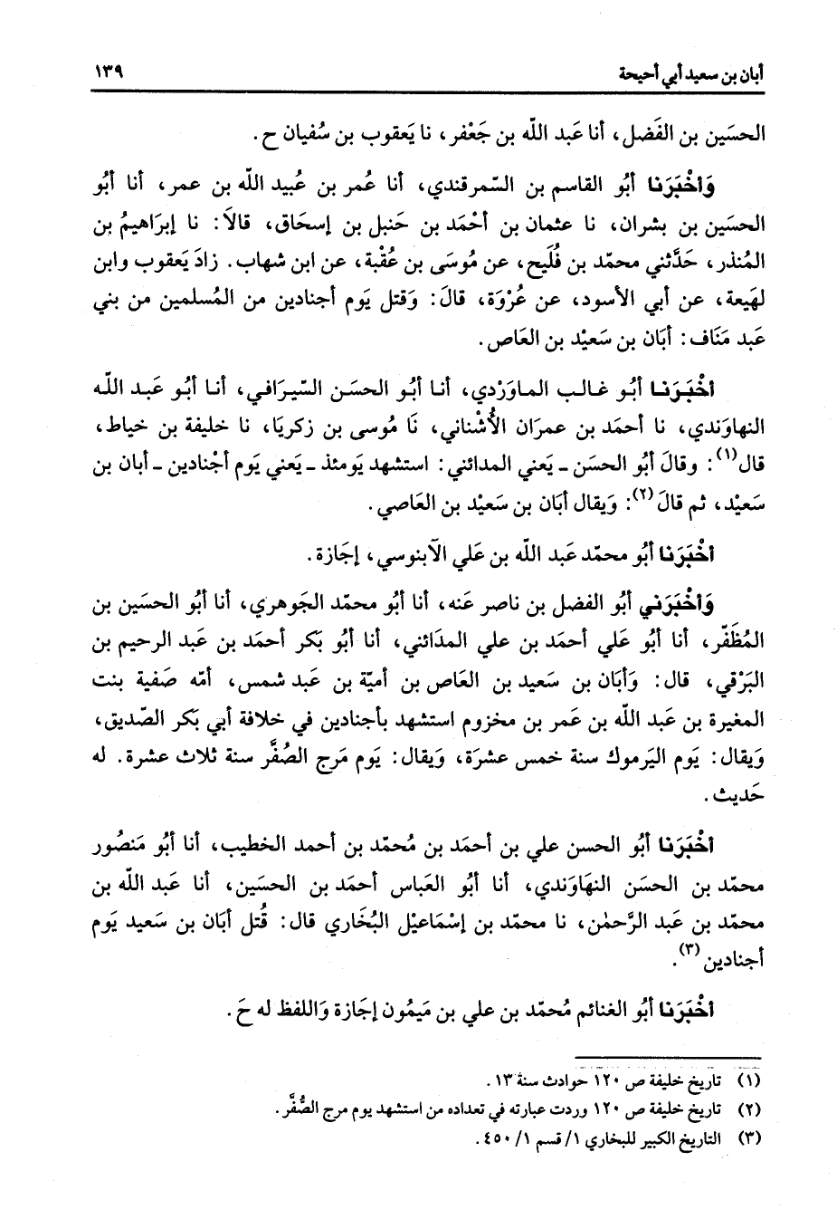الحسين بن الفضل أنا عبد الله بن جعفر نا يعقوب بن سفيان وأخبرنا أبو القاسم بن السمرقندي أنا عمر بن عبيد الله بن عمر أنا أبو الحسين بن بشران نا عثمان بن أحمد بن حنبل بن إسحاق قالا نا إبراهيم بن المنذر حدثني محمد بن فليح عن موسى بن عقبة عن ابن شهاب زاد يعقوب وابن لهيعة عن أبي الأسود عن عروة قال وقتل يوم أجنادين من المسلمين من بني عبد مناف أبان بن سعيد بن العاص أخبرنا أبو غالب الماوردي أنا أبو الحسن السيرافي أنا أبو عبد الله النهاوندي نا أحمد بن عمران الأشناني نا موسى بن زكريا نا خليفة بن خياط قال (1) وقال أبو الحسن يعني المدائني استشهد يومئذ يعني يوم أجنادين أبان بن سعيد ثم قال (2) ويقال أبان بن سعيد بن العاصي أخبرنا أبو محمد عبد الله بن علي الآبنوسي إجازة وأخبرني أبو الفضل بن ناصر عنه أنا أبو محمد الجوهري أنا أبو الحسين بن المظفر أنا أبو علي أحمد بن علي المدائني أنا أبو بكر أحمد بن عبد الرحيم بن البرقي قال وأبان بن سعيد بن العاص بن أمية بن عبد شمس أمه صفية بنت المغيرة بن عبد الله بن عمر بن مخزوم استشهد بأجنادين في خلافة أبي بكر الصديق ويقال يوم اليرموك سنة خمس عشرة ويقال يوم مرج الصفر سنة ثلاث عشرة له حديث أخبرنا أبو الحسن علي بن أحمد بن محمد بن أحمد الخطيب أنا أبو منصور محمد بن الحسن النهاوندي أنا أبو العباس أحمد بن الحسين أنا عبد الله بن محمد بن عبد الرحمن نا محمد بن إسماعيل البخاري قال قتل أبان بن سعيد يوم أجنادين (3) أخبرنا أبو الغنائم محمد بن علي بن ميمون إجازة واللفظ له