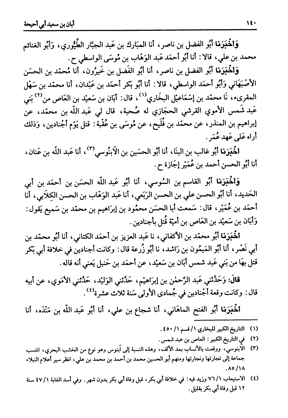 وأخبرنا أبو الفضل بن ناصر أنا المبارك بن عبد الجبار الطيوري وأبو الغنائم محمد بن علي قالا أنا أبو أحمد عبد الوهاب بن موسى الواسطي وأخبرنا أبو الفضل بن ناصر أنا أبو بكر الفضل بن خيرون أنا محمد بن الحسن الأصبهاني وأبو أحمد الواسطي قالا أنا أبو بكر أحمد بن عبدان أنا محمد بن سهل المقرئ نا محمد بن إسماعيل البخاري (1) قال أبان بن سعيد بن العاص (2) من بني عبد شمس الأموي القرشي الحجازي له صحبة قال لي عبد الله بن محمد عن إبراهيم بن المنذر عن محمد بن فليح عن موسى بن عقبة قتل يوم أجنادين وذلك أراه على عهد عمر أخبرنا أبو غالب بن البنا أنا أبو الحسين بن الآبنوسي (3) أنا عبد الله بن عنان أنا أبو الحسن أحمد بن عمير إجازة وأخبرنا أبو القاسم بن السوسى أنا أبو عبد الله الحسن بن أحمد بن أبي الحديد أنا أبو الحسن علي بن الحسن الربعي أنا عبد الوهاب بن الحسن الكلابي أنا أحمد بن عمير قال سمعت أبا الحسن محمود بن إبراهيم بن محمد بن سميع يقول وأبان بن سعيد بن العاص بن أمية قتل بأجنادين أخبرنا أبو محمد بن الأكفاني نا عبد العزيز بن أحمد الكتاني أنا أبو محمد بن أبي نصر أنا أبو الميمون بن راشد نا أبو زرعة قال وكانت أجنادين في خلافة أبي بكر قتل بها من بني عبد شمس أبان بن سعيد عن أحمد بن حنبل يعني أنه قاله قال وحدثني عبد الرحمن بن إبراهيم حدثني الوليد حدثني الأموي عن أبيه قال وكانت وقعة أجنادين في جمادي الأولى سنة ثلاث عشرة (4) أخبرنا أبو الفتح الماهاني أنا شجاع بن علي أنا أبو عبد الله بن منده أنا