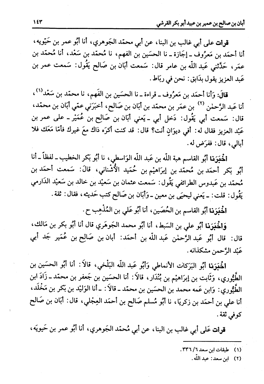 قرأت على أبي غالب بن البنا عن أبي محمد الجوهري أنا أبو عمر بن حيوية أنا أحمد بن معروف إجازة نا الحسين بن الفهم نا محمد بن سعد أنا محمد بن عمر حدثني عبد الله بن عامر قال سمعت أبان بن صالح يقول سمعت عمر بن عبد العزيز يقول بدابق نحن في رباط قال وأنا أحمد بن معروف قرءاة نا الحسين بن الفهم نا محمد بن سعد أنا عبد الرحمن (2) بن عمر بن محمد بن أبان بن صالح أخبرني عمي أبان بن محمد قال سمعت أبي يقول دخل أبي يعني أبان بن صالح بن عمير على عمر بن عبد العزيز فقال له أفي ديوان أنت قال قد كنت أكره ذاك مع غيرك فأما معك فلا أبالي قال ففرض له أخبرنا أبو القاسم هبة الله بن عبد الله الواسطي نا أبو بكر الخطيب لفظا أنا أبو بكر أحمد بن محمد بن إبراهيم بن حميد الأشناني قال سمعت أحمد بن محمد بن عبدوس الطرائفي يقول سمعت عثمان بن سعيد بن خالد بن سعيد الدارمي يقول قلت يعني ليحيى بن معين وأبان بن صالح كتب حديثه فقال ثقة أخبرنا أبو القاسم بن الحصين أنا أبو علي بن المذهب وأخبرنا أبو علي بن السبط أنا أبو محمد الجوهري قال أنا أبو بكر بن مالك قال قال أبو عبد الرحمن عبد الله بن أحمد أبان بن صالح بن عمير جد أبي عبد الرحمن مشكذانه أخبرنا أبو البركات الأنماطي وأبو عبد الله البلخي قالا أنا أبو الحسين بن الطيوري وثابت بن إبراهيم بن بندار قالا أنا الحسين بن جعفر بن محمد زاد ابن الطيوري وابن عمه محمد بن الحسين بن محمد قالا أنا الوليد بن بكر بن مخلد أنا علي بن أحمد بن زكريا نا أبو مسلم صالح بن أحمد العجلي قال أبان بن صالح كوفي ثقة قرأت على أبي غالب بن البنا عن أبي محمد الجوهري أنا أبو عمر بن حيوية