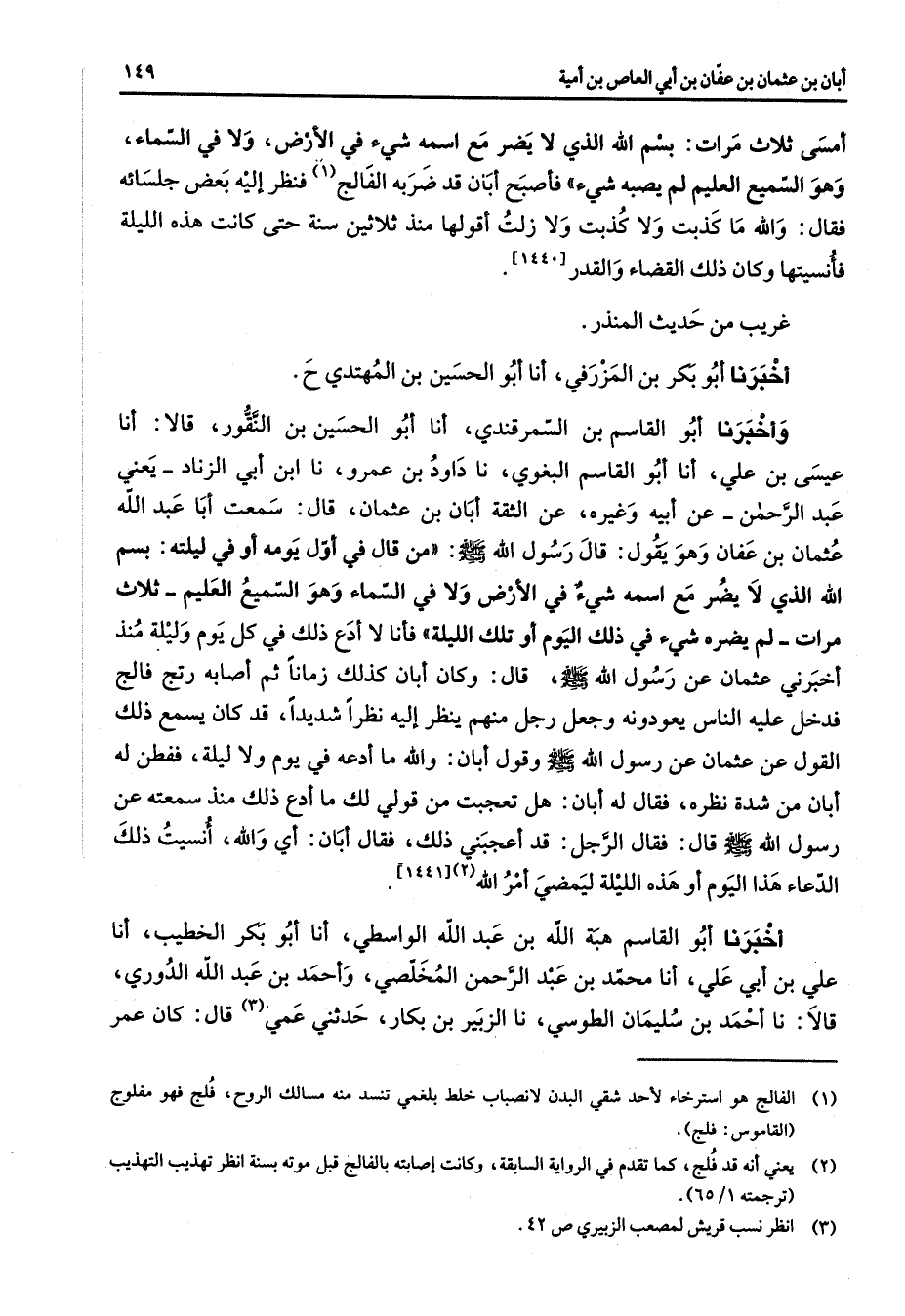 [1440] غريب من حديث المنذر أخبرنا أبو بكر بن المزرفي أنا أبو الحسين بن المهتدي وأخبرنا أبو القاسم بن السمرقندي أنا أبو الحسين بن النقور قالا أنا عيسى بن علي أنا أبو القاسم البغوي نا داود بن عمرو نا ابن أبي الزناد يعني عبد الرحمن عن أبيه وغيره عن الثقة أبان بن عثمان قال سمعت أبا عبد الله عثمان بن عفان وهو يقول قال رسول الله (صلى الله عليه وسلم) من قال في أول يومه أو في ليلته بسم الله الذي لا يضر مع اسمه شئ في الأرض ولا في السماء وهو السميع العليم ثلاث مرات لم يضره شئ في ذلك اليوم أو تلك الليلة فأنا لا أدع ذلك في كل يوم وليلة منذ اخبرني عثمان عن رسول الله (صلى الله عليه وسلم) قال وكان أبان كذلك زمانا ثم أصابه رتج فالج فدخل عليه الناس يعودونه وجعل رجل منهم ينظر إليه نظرا شديدا قد كان يسمع ذلك القول عن عثمان عن رسول الله (صلى الله عليه وسلم) وقول أبان والله ما أدعه في يوم ولا ليلة ففطن له أبان من شدة نظره فقال له أبان هل تعجبت من قولي لك ما أدع ذلك منذ سمعته عن رسول الله (صلى الله عليه وسلم) قال فقال الرجل قد أعجبني ذلك فقال أبان أي والله أنسيت ذلك الدعاء هذا اليوم أو هذه الليلة ليمضي أمر الله