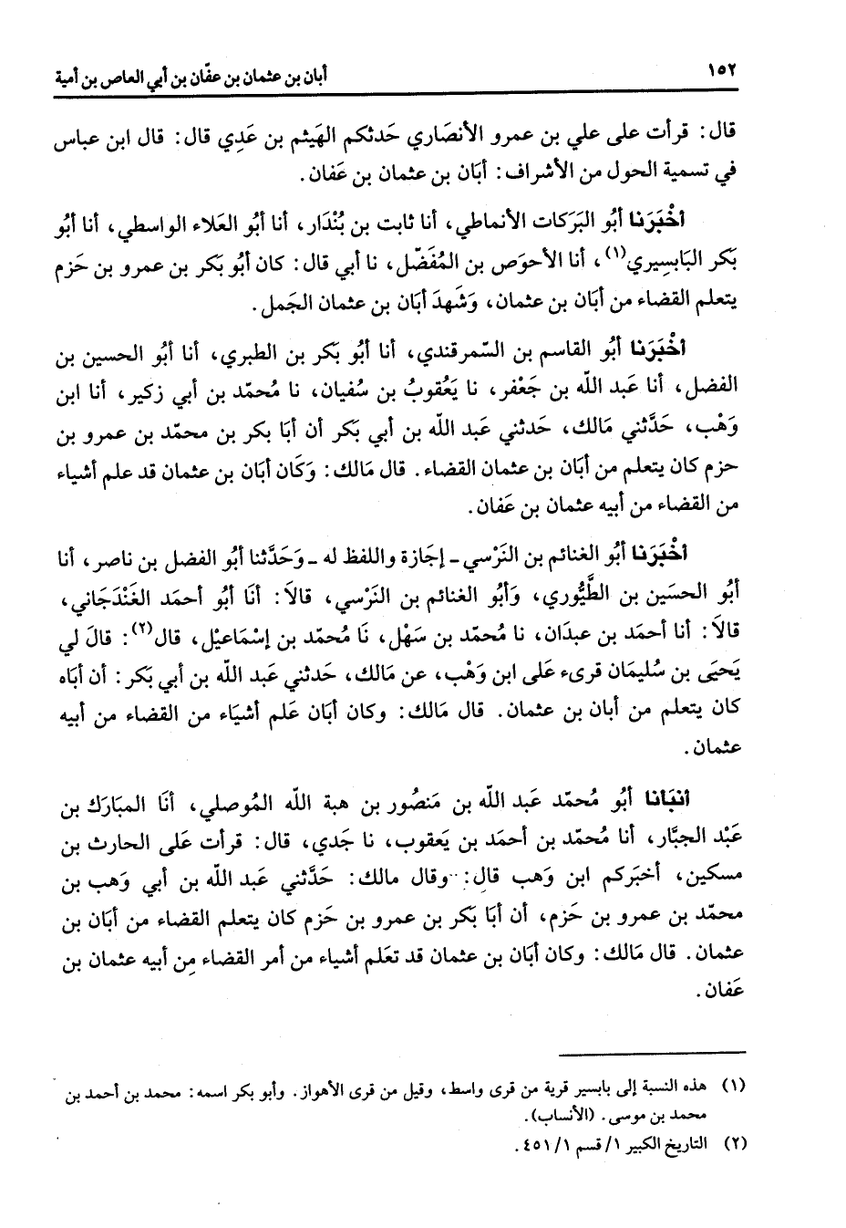 قال قرات على علي بن عمرو الأنصاري حدثكم الهيثم بن عدي قال قال ابن عباس في تسمية الحول من الأشراف أبان بن عثمان بن عفان أخبرنا أبو البركات الأنماطي أنا ثابت بن بندار أنا أبو العلاء الواسطي أنا أبو بكر البابسيري (1) أنا الأحوص بن المفضل نا أبي قال كان أبو بكر بن عمرو بن حزم يتعلم القضاء من أبان بن عثمان وشهد أبان بن عثمان الجمل أخبرنا أبو القاسم بن السمرقندي أنا أبو بكر بن الطبري أنا أبو الحسين بن الفضل أنا عبد الله بن جعفر نا يعقوب بن سفيان نا محمد بن أبي زكير أنا ابن وهب حدثني مالك حدثني عبد الله بن أبي بكر أن أبا بكر بن محمد بن عمرو بن حزم كان يتعلم من أبان بن عثمان القضاء قال مالك وكان أبان بن عثمان قد علم أشياء من القضاء من أبيه عثمان بن عفان أخبرنا أبو الغنائم بن النرسي إجازة واللفظ له وحدثنا أبو الفضل بن ناصر أنا أبو الحسين بن الطيوري وأبو الغنائم بن النرسي قالا أنا أبو أحمد الغندجاني قالا أنا أحمد بن عبدان نا محمد بن سهل نا محمد بن إسماعيل قال (2) قال لي يحيى بن سليمان قرئ على ابن وهب عن مالك حدثني عبد الله بن أبي بكر أن أباه كان يتعلم من أبان بن عثمان قال مالك وكا أبان علم أشياء من القضاء من أبيه عثمان أنبأنا أبو محمد عبد الله بن منصور بن هبة الله الموصلي أنا المبارك بن عبد الجبار أنا محمد بن أحمد بن يعقوب نا جدي قال قرأت على الحارث بن مسكين اخبركم ابن وهب قال وقال مالك حدثني عبد الله بن أبي وهب بن محمد بن عمرو بن حزم أن أبا بكر بن عمرو بن حزم كان يتعلم القضاء من أبان بن عثمان قال مالك وكان أبان بن عثمان قد تعلم أشياء من أمر القضاء من أبيه عثمان بن عفان