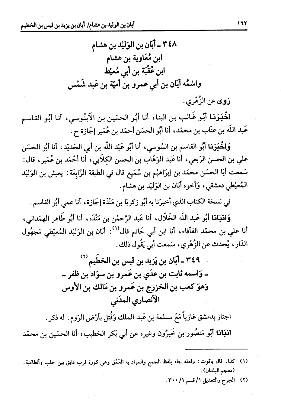348 - أبان بن الوليد بن هشام ابن معاوية بن هشام ابن عقبة بن أبي معيط واسمه أبان بن أبي عمرو بن أمية بن عبد شمس روى عن الزهري أخبرنا أبو غالب بن البنا أنا أبو الحسين بن الآبنوسي أنا أبو القاسم عبد الله بن عتاب بن محمد أنا أبو الحسن أحمد بن عمير إجازة ح وأخبرنا أبو القاسم بن السوسي أنا أبو عبد الله بن أبي الحديد أنا أبو الحسن علي بن الحسن الربعي أنا عبد الوهاب بن الحسن الكلابي أنا أحمد بن عمير قال سمعت أبا الحسن محمد بن إبراهيم بن سميع قال في الطبقة الرابعة يعيش بن الوليد المعيطي دمشقي وأخوه أبان بن الوليد بن هشام في نسخة الكتاب الذي أخبرنا به أبو زكريا بن مندة إجازة أنا عمي أبو القاسم وأنبأنا أبو عبد الله الخلال أنا عبد الرحمن بن منده أنا أبو طاهر الهمداني أنا علي بن محمد الفأفاء أنا ابن أبي حاتم قال أبان بن الوليد المعيطي مجهول الدار يحدث عن الزهري سمعت أبي يقول ذلك