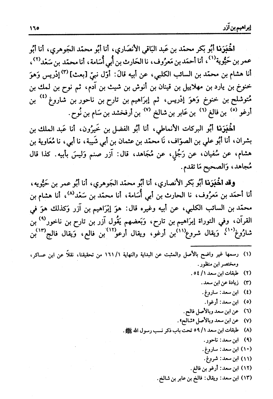 أخبرنا أبو بكر محمد بن عبد الباقي الأنصاري أنا أبو محمد الجوهري أنا أبو عمر بن حيوية (1) أنا أحمد بن معروف نا الحارث بن أبي أسامة أنا محمد بن سعد (2) أنا هشام بن محمد بن السائب الكلبي عن أبيه قال أول نببعث (3) إدريس وهو خنوخ بن يارد بن مهلاييل بن قينان بن أنوش بن شيث بن آدم ثم نوح بن لمك بن متوشلح بن خنوخ وهو إدريس ثم إبراهيم بن تارح بن ناحور بن شارو (4) بن أرغو (5) بن فالغ (6) بن عابر بن شالخ (7) بن أرفخشد بن سام بن نوح أخبرنا أبو البركات الأنماطي أنا أبو الفضبل بن خيرون أنا عبد الملك بن بشران أنا أبو علي بن الصواف نا محمد بن عثمان بن أبي شيبة نا أبي نا معاوية بن هشام بن سفيان عن رجل عن مجاهد قال آزر صنم وليس بأبيه كذا قال مجاهد والصحيح ما تقدم وقد أخبرنا أبو بكر الأنصاري أنا أبو محمد الجوهري أنا أبو عمر بن حيويه أنا أحمد بن معروف نا الحارث بن أبي أسامة أنا محمد بن سعد (8) أنا هشام بن محمد بن السائب الكلبي عن أبيه وغيره قال هو إبراهيم بن آزر وكذلك هو في القرآن وفي التوراة إبراهيم بن تارح وبعضهم يقول آزر بن تارح بن ناخور (9) بن شاروغ (10) وقال شروع (11) بن أرغو ويقال أرعو (12) بن فالع ويقال فالج (13) بن