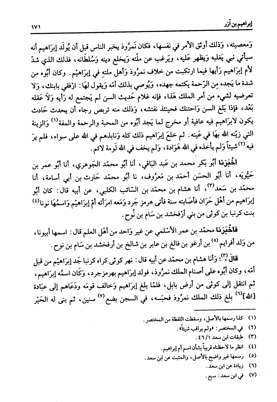 ومعصيته وذلك أوثق الأمر في نفسها فكان نمروذ يخبر الناس قبل أن يولد إبراهيم أنه سيأتي نبي يغلبه ويظهر عليه ويرغب عن ملته ويخلع دينه وسلطانه فذلك الذي شد لأم إبراهيم رأيها فيما ارتكبت من خلاف نمروذ وأهل ملته في إبراهيم وكان أبوه من شدة ما يجده من الرحمة يكتمه جهده ويوصي بذلك أمه ويقول لها ارفقي بابنك ولا تعرضيه لشئ من أمر الملك هذا فأنه غلام حديث السن لم يجتمع له رأيه ولا عقله بعد فإذا بلغ السن واحتنك فحينئذ نفتشه وذلك منه تربص رجاء أن يحدث حادث يكون لإبراهيم فيه عافية أو مخرج لما يجد أبوه من المحبة والرحمة والمفة (1) والزينة التي زينه الله بها في عينه ثم خلع إبراهيم ذلك كله ونابذهم في الله على سواء فلم ير فيه (2) شيئا ولم يأخذه في الله هوادة ولم يخف في الله لومة لائم أخبرنا أبو بكر محمد بن عبد الباقي أنا محمد الجوهري أنا أبو عمر بن حيويه أنا الحسن أحمد بن معروف نا أبو محمد حارث بن أبي أسامة أنا محمد بن سعد (3) أنا هشام بن محمد بن السائب الكلبي عن أبيه قال كان أبو إبراهيم من أهل حران فأصابته سنة فأتى هرمز جرد ومعه امرأته أم إبراهيم واسمها نونا (4) بنت كربنا بن كوثى من بني أرفخشد بن سام بن نوح فاخبرنا محمد بن عمر الأسلمي عن غير واحد من أهل العلم قال اسمها أبوينا من ولد أفرايم (5) بن أرغوبن فالغ بن عابر بن شالخ بن أرفخشد بن سام بن نوح قال (3) وأنا هشام بن محمد عن أبيه قال نهر كوثى كراه كربنا جد إبراهيم من قبل أمه وكان أبوه على أصنام الملك نمرود فولد إبراهيم بهرمزجرد وكان اسمه إبراهيم ثم انتقل إلى كوثى من أرض بابل فلما بلغ إبراهيم وخالف قومه ودعاهم إلى عبادة الله (6) بلغ ذلك الملك نمو وذفحبسه في السجن بضع (7) سنين ثم بنى له الحير