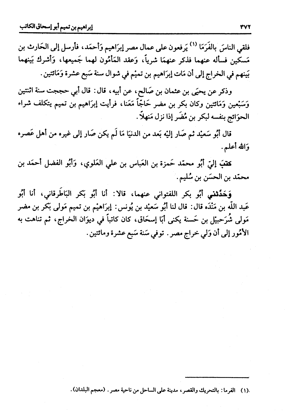 فلقي الناس بالفرما (1) يرفعون على عمال مصر إبراهيم وأحمد فأرسل إلى الحارث بن مسكين فسأله عنهما فذكر عنهما شربا وعقد المأمون لهما جميعها وأشرك بينهما بينهم في الخراج إلى أن مات إبراهيم بن تميم في شوال سنة سبع عشرة ومائتين وذكر عن يحيى بن عثمان بن صالح عن أبيه قال قال أبي حججت سنة اثنتين وسبعين ومائتين وكان بكر بن مضر حاجا معنا فرأيت إبراهيم بن تميم يتكلف شراء الحوائج بنفسه لبكر بن مضر إذا نزل منهلا قال أبو سعيد ثم صار إليه بعد من الدنيا ما لم يكن صار إلى غيره من أهل عصره والله أعلم كتب إلي أبو محمد حمزة بن العباس بن علي العلوي وأبو الفضل أحمد بن محمد بن الحسن بن سليم وحدثني أبو بكر اللفتواني عنهما قالا أنا أبو بكر الباطرقاني أنا أبو عبد الله بن منده قال قال لنا أبو سعيد بن يونس إبراهيم بن تميم مولى بكر بن مضر مولى شرحبيل بن حسنة يكنى أبا إسحاق كان كاتبا في ديوان الخراج ثم تناهت به الأمور إلى أن ولي خراج مصر توفي سنة سبع عشرة ومائتين "