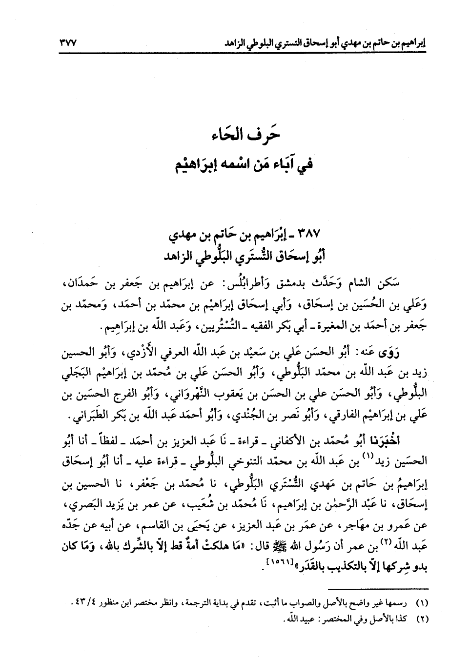 387 - إبراهيم بن حاتم بن مهدي أبو إسحاق التستري البلوطي الزاهد سكن الشام وحدث بدمشق وأطرابلس عن إبراهيم بن جعفر بن حمدان وعلي بن الحسين بن إسحاق وأبي إسحاق إبراهيم بن محمد بن أحمد ومحمد بن جعفر بن أحمد بن المغيرة أبي بكر الفقيه التستريين وعبد الله بن إبراهيم روى عنه أبو الحسن علي بن سعيد بن عبد الله العرفي الأزدي وأبو الحسين زيد بن عبد الله بن محمد البلوطي وأبو الحسن علي بن محمد بن إبراهيم البجلي البلوطي وأبو الحسن علي بن الحسن بن يعقوب النهرواني وأبو الفرج الحسين بن علي بن إبراهيم الفارقي وأبو نصر بن الجندي وأبو أحمد عبد الله بن بكر الطبراني أخبرنا أبو محمد بن الأكفاني قراءة نا عبد العزيز بن أحمد لفظا أنا أبو الحسين زيد (1) بن عبد الله بن محمد التنوخي البلوطي قراءة عليه أنا أبو إسحاق إبراهيم بن حاتم بن مهدي التستري البلوطي نا محمد بن جعفر نا الحسين بن إسحاق نا عبد الرحمن بن إبراهيم نا محمد بن شعيب عن عمر بن يزيد البصري عن عمرو بن مهاجر عن عمر بن عبد العزيز عن يحيى بن القاسم عن أبيه عن جده عبد الله (2) بن عمر أن رسول الله (صلى الله عليه وسلم) قال ما هلكت أمة قط إلا بالشرك بالله وما كان بدو شركها إلا بالتكذيب بالقدر