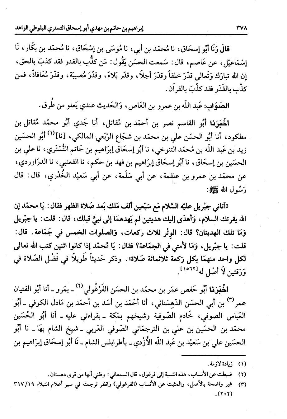 قال ونا أبو إسحاق نا محمد بن أبي نا موسي بن إسحاق نا محمد بن بكار نا إسماعيل عن عاصم قال سمعت الحسن يقول من كذب بالقدر فقد كذب بالحق إن الله تبارك وتعالى قدر خلقا وقدر أجلا وقدر بلاء وقدر مصيبة وقدر معافاة فمن كذب بالقدر فقد كذب بالقرآن الصواب عبد الله بن عمرو بن العاص والحديث عندي يعلو من طرق أخبرنا أبو القاسم نصر بن أحمد بن مقاتل أنا جدي أبو محمد مقاتل بن مطكود أنا أبو الحسن علي بن محمد بن شجاع الربعي المالكي (1) نا أبو الحسين زيد بن عبد الله بن محمد التنوخي نا أبو إسحاق إبراهيم بن حاتم التستري نا علي بن الحسين بن إسحاق نا أبو إسحاق إبراهيم بن فهد بن حكم نا القعنبي نا الدراوردي عن محمد بن عمرو بن علقمة عن أبي سلمة عن أبي سعيد الخدري قال قال رسول الله (صلى الله عليه وسلم) أتاني جبريل عليه السلام مع سبعين ألف ملك بعد صلاة الظهر فقال يا محمد إن الله يقرئك السلام وأهدى إليك هديتين لم يهدهما إلى نبي قبلك قال قلت يا جبريل وما تلك الهديتان قال الوتر ثلاث ركعات والصلوات الخمس في جماعة قال قلت يا جبريل وما لأمتي في الجماعة فقال يا محمد إذا كانوا اثنين كتب الله تعالى لكل واحد منهما بكل ركعة ثلاثمائة صلاة وذكر حديثا طويلا في فضل الصلاة في ورقتين لا أصل له