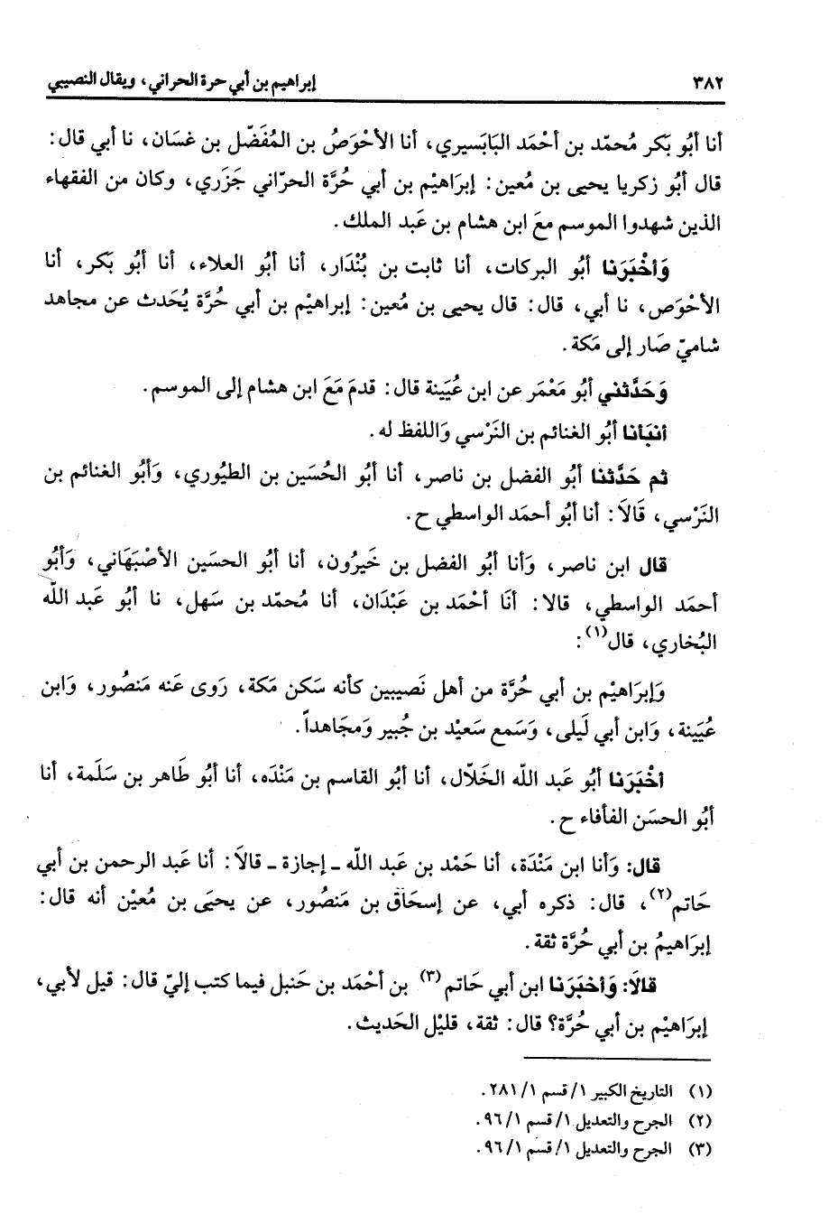 أنا أبو بكر محمد بن أحمد البابسيري أنا الأحواص بن المفضل بن غسان نا أبي قال قال أبو زكريا يحيى بن معين إبراهيم بن أبي حرة الحراني جزري وكان من الفقهاء الذين شهدوا الموسم مع ابن هشام بن عبد الملك وأخبرنا أبو البركات أنا ثابت بن بندار أنا أبو العلاء أنا أبو بكر أنا الأحوص نا أبي قال قال يحيى بن معين إبراهيم بن أبي حرة يحدث عن مجاهد شامي صار إلى مكة وحدثني أبو معمر عن ابن عيينة قال قدم مع ابن هشام إلى المواسم أنبأنا أبو الغنائم بن النرسي واللفظ له ثم حدثنا أبو الفضل بن ناصر أنا أبو الحسين بن الطيوري وأبو الغنائم بن النرسي قالا أنا أبو أحمد الواسطي قال ابن ناصر وأنا أبو الفضل بن خيرون أنا أبو الحسين الأصبهاني وأبو أحمد الواسطي قالا أنا أحمد بن عبدان أنا محمد بن سهل نا أبو عبد الله البخاري قال وإبراهيم بن أبي حرة من أهل نصيبين كأنه سكن مكة روى عنه منصور وابن عيينة وابن أبي ليلى وسمع سعيد بن جبير ومجاهدا أخبرنا أبو عبد الله الخلال أنا أبو القاسم بن منده أنا أبو طاهر بن سلمة أنا أبو الحسن الفأفاء قال وأنا ابن منده أنا حمد بن عبد الله إجازة قالا أنا عبد الرحمن بن أبي حاتم (2) قال ذكره أبي إسحاق بن منصور عن يحيى بن معين أنه قال إبراهيم بن أبي حرة ثقة قال وأخبرنا ابن أبي حاتم (3) بن أحمد بن حنبل فيما كتب إلي قال قيل لأبي إبراهيم بن أبي حرة قال ثقة قليل الحديث