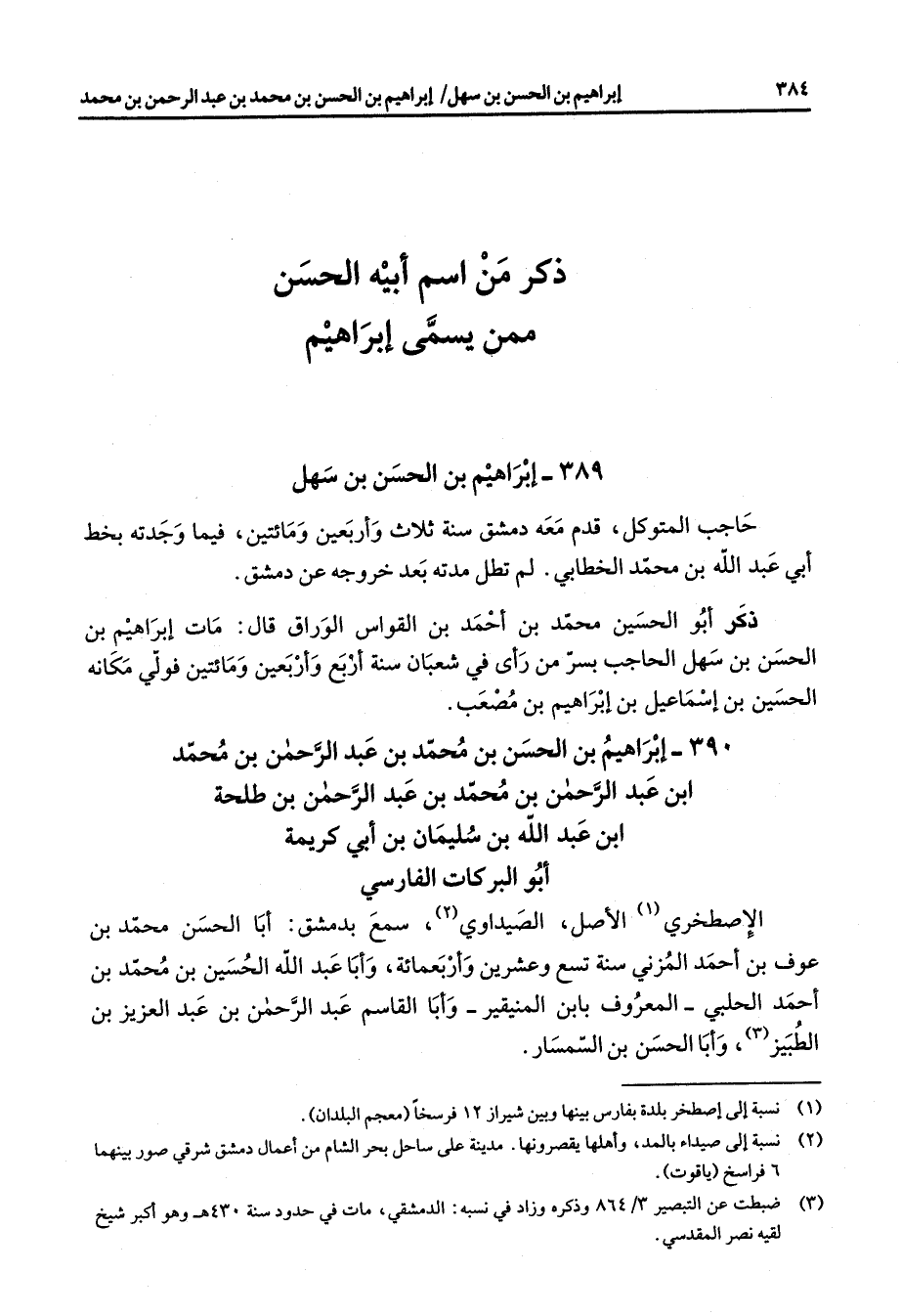 389 - إبراهيم بن الحسن بن سهل حاجب المتوكل قدم معه دمشق سنة ثلاث وأربعين ومائتين فيما وجدته بخط أبي عبد الله بن محمد الخطابي لم تطل مدته بعد خروجه عن دمشق ذكر أبو الحسين محمد بن أحمد بن القواس الوراق قال مات إبراهيم بن الحسن بن سهل الحاجب بسر من رأى في شعبان سنة أربع وأربعين ومائتين فولي مكانه الحسين بن إسماعيل بن إبراهيم بن مصعب