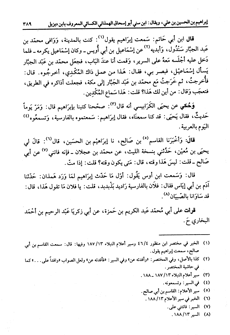 قال ابن أبي حاتم سمعت إبراهيم يقول (1) كنت بالمدينة ووافى محمد بن عبد الجبار سندول وأبديه (2) عن إسماعيل بن أبي أويس وكان إسماعيل يكرمه فلما دخل عليه أجلسه معه على السرير وقمت أنا عند الباب فجعل محمد بن عبد الجبار يسأل إسماعيل فبصر بي فقال هذا من عمل ذاك المكدي أخرجوه قال فأخرجت ثم خرجت مع محمد بن عبد الجبار إلى مكة فجعلت أذاكره في الطريق فتعجب وقال من أين لك هذا قلت هذا سماع المكدين وحكي عن يحيى الكرابيسي أنه قال (3) صححنا كتبنا بإبراهيم قال ومر يوما حديث فقال يحيى قد كنا سمعناه فقال إبراهيم سمعتموه بالفارسية وتسمعوه (4) اليوم بالعربية قال وأخبرنا القاسم (5) بن صالح نا إبراهيم بن الحسين قال (6) قال لي يحيى بن معين حدثني بنسخة الليث عن محمد بن عجلان فإنه فاتني (7) عن أبي صالح قلت ليس هذا وقته قامتى يكون وقته قلت إذا مت قال وسمعت ابن أوس يقول أول ما حدث إبراهيم لمورد همذان حدثنا آدم بن أبي إياس فقال فلان بالفارسية راديد بذبدبد قلت يا فلان ما تقول هذا قال قد ساوانا بالصبيان (8) قرأت على أبي محمد عبد الكريم بن حمزة عن أبي زكريا عبد الرحيم بن أحمد البخاري ح