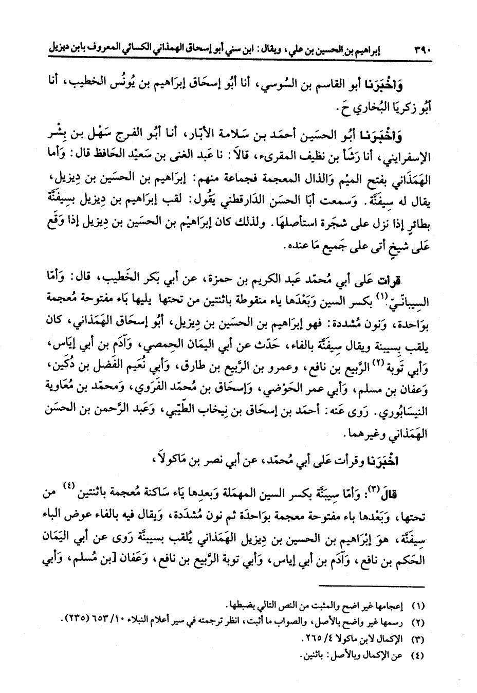 وأخبرنا أبو القاسم بن السوسي أنا أبن إسحاق إبراهيم بن يونس الخطيب أنا أبو زكريا البخاري وأخبرنا أبو الحسين أحمد بن سلامة الأبار أنا أبو الفرج سهل بن بشر الإسفرايني أنا رشأ بن نظيف المقرئ قالا نا عبد الغنى بن سعيد الحافظ قال وأما الهمذاني بفتح الميم والذال المعجمة فجماعة منهم إبراهيم بن الحسين بن ديزيل يقال له سفينة وسمعت أبا الحسن الدارقطني يقول لقب إبراهيم بن ديزيل بسفينة بطائر إذا نزل على شجرة استأصلها ولذلك كان إبراهيم بن الحسين بن ديزيل إذا وقع على شيخ أتى على جميع ما عنده قرأت على أبي محمد عبد الكريم بن حمزة عن أبي بكر الخطيب قال وأما السيباني (1) بكسر السين وبعدها ياء منقوطة باثنتين من تحتها يليها باء مفتوحة معجمة بواحدة ونون مشددة فهو إبراهيم بن الحسين بن ديزيل أبو إسحاق الهمذاني كان يلقب بسيبنة ويقال سفينة بالفاء حدث عن أبي اليمان الحمصي وآدم بن أبي إياس وأبى توبة (2) الربيع بن نافع وعمرو بن الربيع بن طارق وأبي نعيم الفضل بن دكين وعفان بن مسلم وأبي عمر الحوضي وإسحاق بن محمد الفروي ومحمد بن معاوية النيسابوري روى عن أحمد بن إسحاق بن نيخاب الطيبي وعبد الرحمن بن الحسن الهمذاني وغيرهما أخبرنا وقرأت على أبي محمد عن أبي نصر بن ماكولا قال (3) وأما سيبنة بكسر السين المهملة وبعدها ياء ساكنة معجمة باثنتين (4) من تحتها وبعدها باء مفتوحة معجمة بواحدة ثم نون مشددة ويقال فيه بالفاء عوض الباء سيفنة هو إبراهيم بن الحسين بن ديزيل الهمذاني يلقب بسيبنة روى عن أبي اليمان الحكم بن نافع وآدم بن أبي إياس وأبي توبة الربيع بن نافع وعفان بن مسلم وأبي