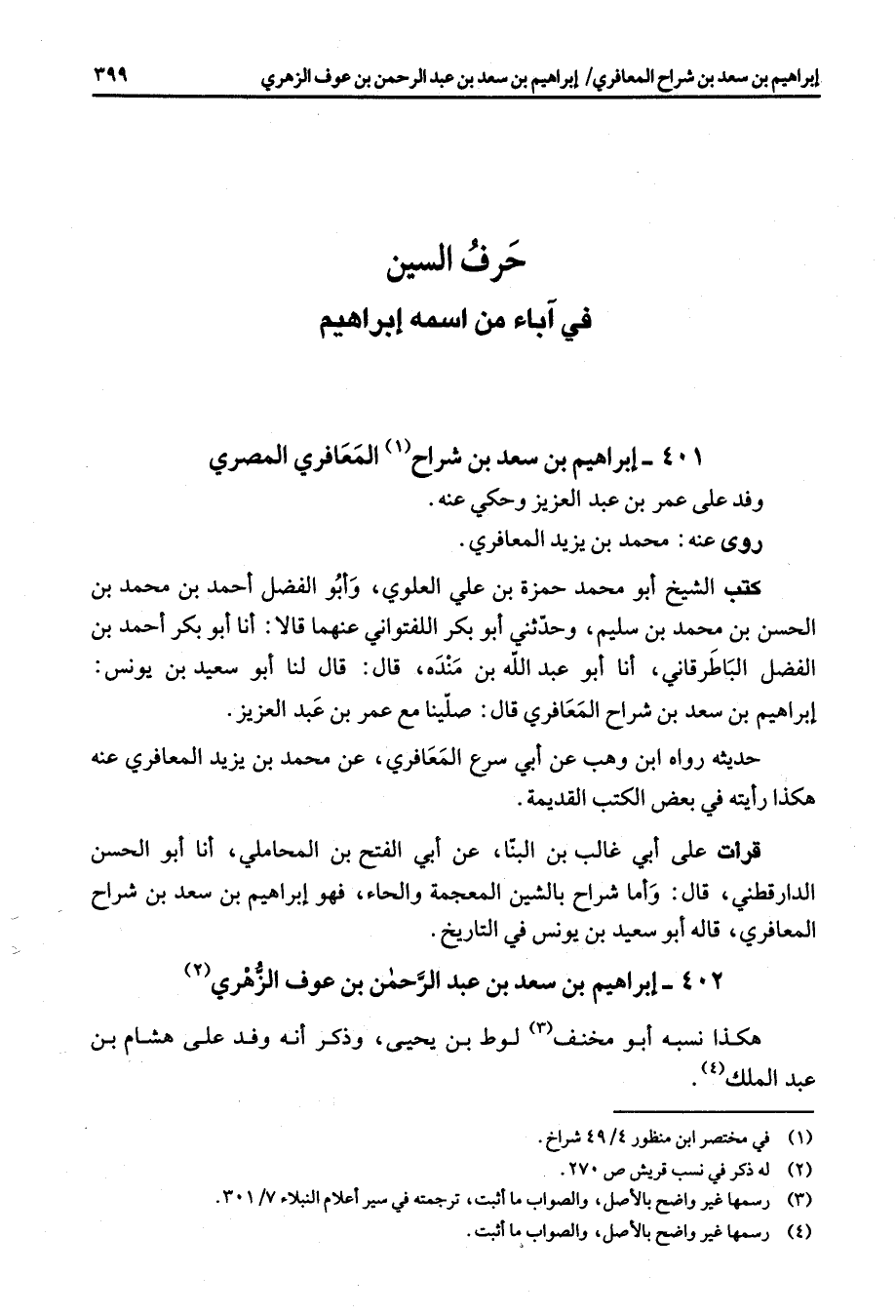 401 - إبراهيم بن سعد بن شراح (1) المعافري المصري وفد على عمر بن عبد العزيز وحكي عنه روى عنه محمد بن يزيد المعافري كتب الشيخ أبو محمد حمزة بن علي العلوي وأبو الفضل أحمد بن محمد بن الحسن بن محمد بن سليم وحدثني أبو بكر اللفتواني عنهما قالا أنا أبو بكر أحمد بن الفضل الباطرقاني أنا أبو عبد الله بن منده قال قال لنا أبو سعيد بن يونس إبراهيم بن سعد بن شراح المعافري قال صلينا مع عمر بن عبد العزيز حديثه رواه ابن وهب عن أبي سرع المعافري عن محمد بن يزيد المعافري عنه هكذا رأيته في بعض الكتب القديمة قرأت على أبي غالب بن البنا عن أبي الفتح بن المحاملي أنا أبو الحسن الدارقطني قال وأما شراح بالشين المعجمة والحاء فهو إبراهيم بن سعد بن شراح المعافري قاله أبو سعيد بن يونس في التاريخ