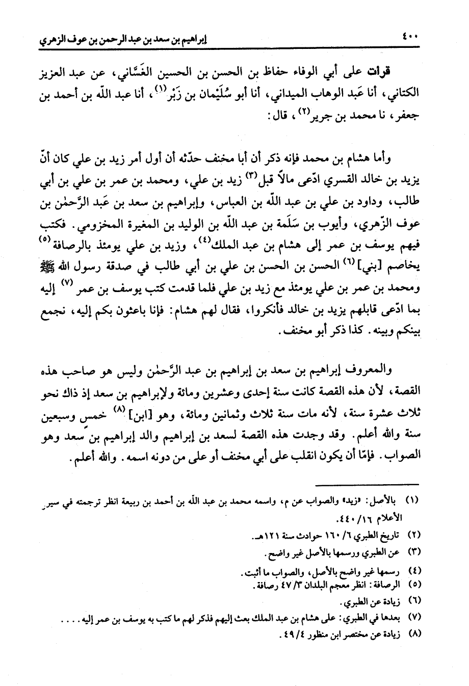 قرأت على أبي الوفاء حفاظ بن الحسن بن الحسين الغساني عن عبد العزيز الكتابي أنا عبد الوهاب الميداني أنا أبو سليماني بن زبر أنا عبد الله بن احمد بن جعفر نا جرير (2) قال وأما هشام بن محمد فإنة ذكر أن أبا مخنف حدثه أن أول أمر زيد بن علي كان أن يزيد بن خالد القسري ادعى مالا قبل (3) زيد بن علو محمد بن عمر بن علي بن أبي طالب وداود بن علي بن عبد الله بن العباس وإبراهيم بن سعد بن عبد الرحمن بن عوف الزهري وأيوب بن سلمه بن عبد الله بن الوليد بن المغيرة المخزومي فكتب فيهم يوسف بن عمر إلى هشام بن عبد الملك (4) وزيد بن علي يومئذ بالرصافة (5) يخاصم بني (6) الحسن بن الحسن بن علي بن أبي طالب في صدقة رسول الله (صلى الله عليه وسلم) ومحمد بن عمر بن علي يومئذ مع زيد بن علي فلما قدمت كتب يوسف بن عمر (7) إليه بما ادعى قابلهم يزيد بن خالد فأنكروا فقال لهم هشام فإنا باعثون بكم إليه نجمع بينكم وبينه كذا ذكر أبو مخنف والمعروف إبراهيم بن سعد بن إبراهيم بن عبد الرحمن وليس هو صاحب هذه القصة لأن هذه القصة كانت سنة إحدى وعشرين ومائة ولإبراهيم بن سعد إذ ذاك نحو ثلاث عشرة سنة لأنه مات سنه ثلات وثمانين ومائه وهو ابن خمس وسبعين سنة والله أعلم وقد وجدت هذه القصة لسعد بن إبراهيم والد إبراهيم بن سعد وهو الصواب فإما أن يكون انقلب على أبي مخيف على من دونه اسمه والله أعلم