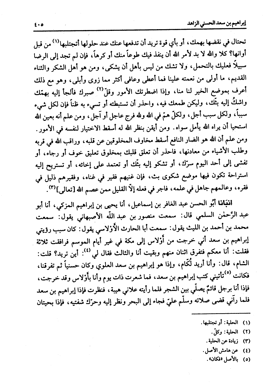 تحتال في نقضها بهمك أو بأي قوة تريد أن تدفعها عنك عند حلولها أتجتلبها (1) من قبل أوانها كلا والله لابد لأمر الله أن ينفذ فيك طوعا أو كرها فإن لم تجد إلى الرضا سبيلا فعليك بالتحمل ولا تشك من ليس بأهل أن يشكى ومن هو أهل الشكر والثناء القديم ما أولى من نعمته علينا فما أعطى وعافى أكثر مما زوى وأبلى وهو مع ذلك أعرف بموضع الخير لنا منا وإذا اضطرتك الأمور وقل (2) صبرك فألجأ إليه بهمك واشك إليه بثك وليكن طمعك فيه وحذا أن تستبطئه أو تسئ به ظنا فإن لكل شئ سببا ولكل سبب أجل ولكل هم في الله ولله فرج عاجل أو اجل ومن علم أنه بعين الله استحيا أن يراه الله يأمل سواه ومن أيقن بنظر الله له أسقط الاختيار لنفسه في الأمور ومن علم أن الله هو الضار النافع أسقط مخاوف المخلوقين عن قلبه وراقب الله في قربه وطلب الأشياء من معادنها فاحذر أن تعلق قلبك بمخلوق تعليق خوف أو رجاء أو تفشى إلى أحد اليوم سرك أو تشكو إليه بثك أو تعتمد على إخائه أو تستريح إليه استراحة تكون فيها موضع شكوى بث فإن غنيهم فقير في غناه وفقيرهم ذليل فس فقره وعالمهم جاهل في علمه فاجر في فعله الا القليل ممن عصم الله تعالى (3) أنبأنا أبو الحسن عبد الغافربن إسماعيل أنا يحيى بن إبراهيم المزكي أنا أبو عبد الرحمن السلمي قال سمعت منصور بن عبد الله الأصبهاني يقول سمعت محمد بن أحمد بن الليث يقول سمعت أبا الحارث الأولاسي يقول كان سبب رؤيتي إبراهيم بن سعد أني خرجت من أولاس إلى مكة في غير أيام الموسم فرافقت ثلاثة فقلت أنا معكم فتفرق اثنان منهم وبقيت أنا والثالث فقال لي (4) أين تريد قلت الشام قال وأنا أريد لكام وإذا هو إبراهيم بن سعد العلوي وكان حسنيا ثم تفرقنا فكانت (5) تأتيني كتب إبراهيم بن سعد فما شعرت ذات يوم وأنا بألاوس وقد خرجت فإذا أنا برجل قائم يصلي بين الشجر فلما رأيته علاني هيبة فنظرت فإذا إبراهيم بن سعد فلما راني قضى صلاته وسلم علي فجاء إلى البحر ونظر إليه وحرك شفيته فإذا بحيتان
