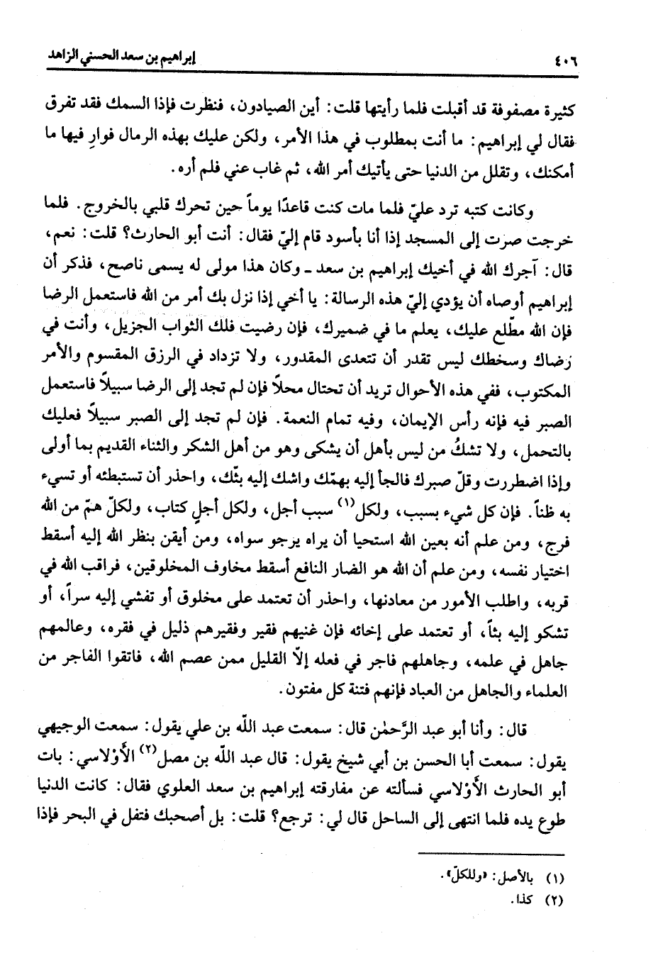 كثيرة مصفوفة قد أقبلت فلما رأيتها قلت أين الصيادون فنظرت فإذا السمك فقد تفرق فقال لي إبراهيم ما أنت بمطلوب في هذا الأمر ولكن عليك بهذه الرمال فوار فيها ما أمكنك وتقلل من الدنيا حتى يأتيك أمر الله ثم غاب عني فلم أره وكانت كتبه ترد علي فلما مات كنت قاعدا يوما حين تحرك قلبي بالخروج فلما خرجت صرت إلى المسجد إذا أنا بأسود قام إلي فقال أنت أبو الحارث قلت نعم قال اجرك الله في أخيك إبراهيم بن سعد وكان هذا مولى له يسمى ناصح فذكر أن إبراهيم أوصاه أن يؤدي إلي هذه الرسالة يا أخي إذا نزل بك أمر من الله فاستعمل الرضا فإن الله مطلع عليك يعلم ما في ضميرك فإن رضيت فلك الثواب الجزيل وأنت في رضاك وسخطك ليس تقدر أن تتعدى المقدور ولا تزداد في الرزق المقسوم والأمر المكتوب ففي هذه الأحوال تريد أن تحتال محلا فإن لم تجد إلى الرضا سبيلا فاستعمل الصبر فيه فإنه رأس الإيمان وفيه تمام النعمة فإن لم تجد إلى الصبر سبيلا فعليك بالتحمل ولا تشك من ليس بأهل أن يشكى وهو من أهل الشكر والثناء القديم بما أولى وإذا اضطررت وقل صبرك فالجأ إليه بهمك واشك إليه بثك واحذر أن تستبطئه أو تسئ به ظنا فإن كل شئ بسبب ولكل سبب أجل ولكل أجل كتاب ولكل (1) هم من الله فرج ومن علم أنه بعين الله استحيا أن يراه يرجو سواه ومن أيقن بنظر الله إليه أسقط اختيار نفسه ومن علم أن الله هو الضار النافع أسقط مخاوف المخلوقين فراقب الله في قربه واطلب الأمور من معادنها واحذر أن تعتمد على مخلوق أو تفشي إليه سرا أو تشكو إليه بثا أو تعتمد على إخائه فإن غنيهم فقير وفقيرهم ذليل في فقره وعالمهم جاهل في علمه وجاهلهم فاجر في فعله الا القليل ممن عصم الله فاتقوا الفاجر من العلماء والجاهل من العباد فإنهم فتنة كل مفتون قال وأنا أبو عبد الرحمن قال سمعت عبد الله بن علي يقول سمعت الوجيهي يقول سمعت أبا الحسن بن أبي شيخ يقول قال عبد الله بن مصل الأولاسي بات أبو الحارث الأولاسي فسألته عن مفارقته إبراهيم بن سعد العلوي فقال كانت الدنيا طوع يده فلما انتهى إلى الساحل قال لي ترجع قلت بل أصحبك فتفل في البحر فإذا