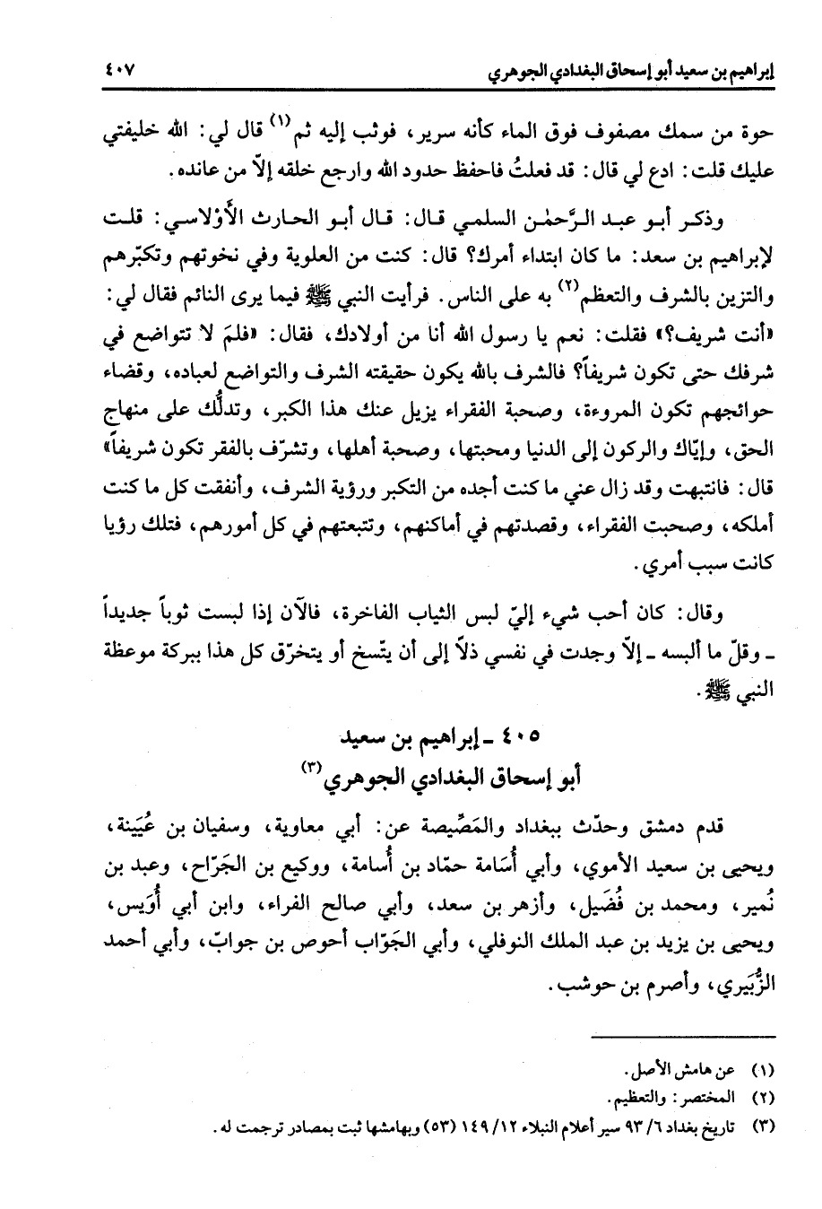 405 - إبراهيم بن سعيد أبو إسحاق البغدادي الجوهري (3) قدم دمشق وحدث ببغداد والمصيصة عن أبي معاوية وسفيان بن عيينة ويحيى بن سعيد الأموي وأبي أسامة حماد بن أسامة ووكيع بن الجراح وعبد بن نمير ومحمد بن فضيل وأزهر بن سعد وأبي صالح الفراء وابن أبي أويس ويحيى بن يزيد بن عبد الملك النوفلي وأبي الجواب أحوص بن جواب وأبي أحمد الزبيري وأصرم بن حوشب