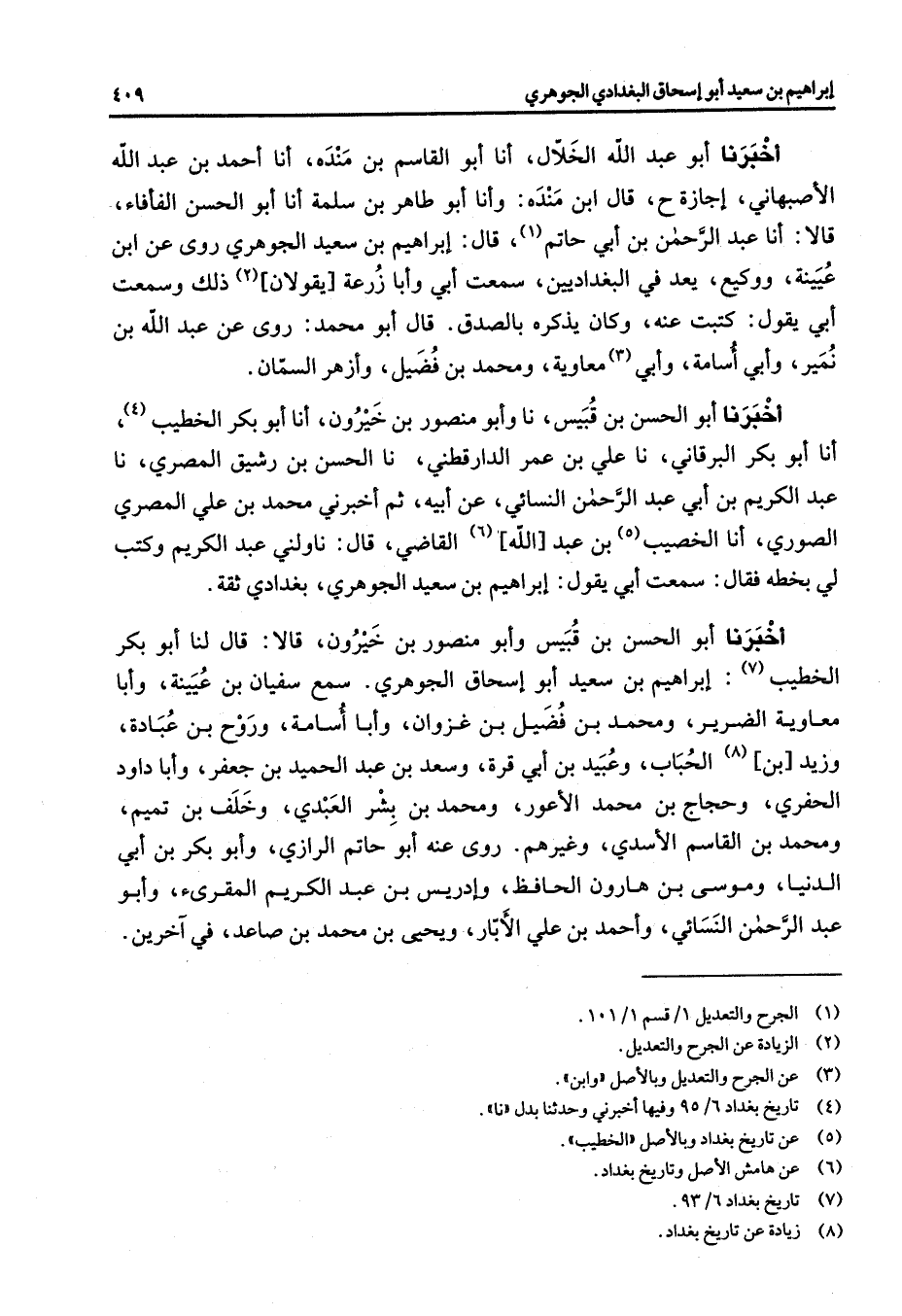 أخبرنا أبو عبد الله الخلال أنا أبو القاسم بن منده أنا أحمد بن عبد الله الأصبهاني إجازة قال ابن منده وأنا أبو طاهر بن سلمة أنا أبو الحسن الفأفاء قالا أنا عبد الرحمن بن أبي حاتم (1) قال إبراهيم بن سعيد الجوهري روى عن ابن عيينة ووكيع يعد في البغداديين سمعت أبي وأبا زرعة يقولان (2) ذلك وسمعت أبي قول كتبت عنه وكان يذكره بالصدق قال أبو محمد روى عن عبد الله بن نمير وأبي أسامة وأبي (3) معاوية ومحمد بن فضيل وأزهر السمان أخبرنا أبو الحسن بن قبيس نا وأبو منصور بن خيرون أنا أبو بكر الخطيب (4) أنا أبو بكر البرقاني نا علي بن عمر الدارقطني نا الحسن بن رشيق المصري نا عبد الكريم بن أبي عبد الرحمن النسائي عن أبيه ثم أخبرني محمد بن علي المصري الصوري أنا الخصيب (5) بن عبد الله (6) القاضي قال ناولني عبد الكريم وكتب لي بخطه فقال سمعت أبي يقول إبراهيم بن سعيد الجوهري بغدادي ثقة أخبرنا أبو الحسن بن قبيس وأبو منصور بن خيرون قالا قال لنا أبو بكر الخطيب (7) إبراهيم بن سعيد أبو إسحاق الجوهري سمع سفيان بن عيينة وأبا معاوية الضرير ومحمد بن فضيل بن غزوان وأبا أسامة وروح بن عبادة وزيد بن (8) الحباب وعبيد بن أبي قرة وسعد بن عبد الحميد بن جعفر وأبا داود الحفري وحجاج بن محمد الأعور ومحمد بن بشر العبدي وخلف بن تميم ومحمد بن القاسم الأسدي وغيرهم روى عنه أبو حاتم الرازي وأبو بكر بن أبي الدنيا وموسى بن هارون الحافظ وإدريس بن عبد الكريم المقرئ وأبو عبد الرحمن النسائي وأحمد بن علي الأبار ويحيى بن محمد بن صاعد في آخرين