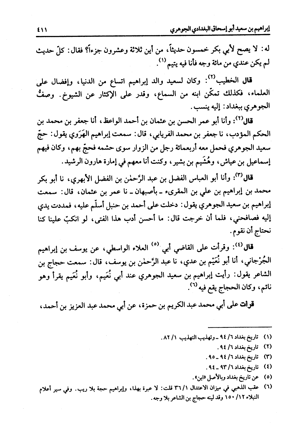 له لا يصح لأبي بكر خمسون حديثا من أين ثلاثة وعشرون جزءا فقال كل حديث لم يكن عندي من مائة وجه فأنا فيه يتيم (1) قال الخطيب (2) وكان لسعيد والد إبراهيم اتساع من الدنيا وإفضال على العلماء فكذلك تمكن ابنه من السماع وقدر على الإكثار عن الشيوخ وصف الجوهري ببغداد إليه ينسب قال (2) وأنا أبو عمر الحسن بن عثمان بن أحمد الواعظ أنا جعفر بن محمد بن الحكم المؤدب نا جعفر بن محمد الفريابي قال سمعت إبراهيم الهروي يقول حج سعيد الجوهري فحمل معه أربعمائة رجل من الزوار سوى حشمه فحج بهم وكان فيهم إسماعيل بن عياش وهشيم بن بشير وكنت أنا معهم في إمارة هارون الرشيد قال (3) وأنا أبو العباس الفضل بن عبد الرحمن بن الفضل الأبهري نا أبو بكر محمد بن إبراهيم بن علي بن المقرئ بأصبهان نا عمر بن عثمان قال سمعت إبراهيم بن سعيد الجوهري يقول دخلت على أحمد بن حنبل أسلم عليه فمددت يدي إليه فصافحني فلما أن خرجت قال ما أحسن أدب هذا الفتى لو انكب علينا كنا نحتاج أن نقوم قال (4) وقرأت على القاضي أبي (5) العلاء الواسطي عن يوسف بن إبراهيم الجرجاني أنا أبو نعيم بن عدي نا عبد الرحمن بن يوسف قال سمعت حجاج بن الشاعر يقول رأيت إبراهيم بن سعيد الجوهري عند أبي نعيم وأبو نعيم يقرأ وهو نائم وكان الحجاج يقع فيه (6) قرأت على أبي محمد عبد الكريم بن حمزة عن أبي محمد عبد العزيز بن أحمد
