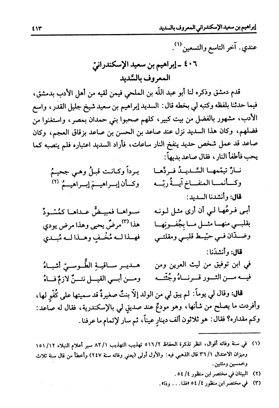 406 - إبراهيم بن سعيد الإسكندراني المعروف بالسديد قدم دمشق وذكره لنا أبو عبد الله بن الملحي فيمن لقيه من أهل الأدب بدمشق فيما حدثنا بلفظه وكتبه لي بخطه قال السديد إبراهيم بن سعيد شيخ جليل القدر واسع الأدب مشهور بالفضل من بيت كبير كلهم صحبوا بني حمدان بمصر واستغنوا من فضلهم وكان هذا السديد نزل عند صاعد بن الحسن بن صاعد بزقاق العجم وكان صاعد قد عمل شخص حديد ينفخ النار ساعات فأراد السديد اعتباره فلم ينصبه كما يحب فأطفأ النار فقال صاعد بديها نار تيممها السديد فردها * بردا وكانت قبل وهي جحيم وكأنما المنفاخ آية ربه * وكأن إبراهيم إبراهيم (2) * قال وأنشدنا السديد أبى فرعها لي أن أرى مثل لونه * سواها فمبيض عداها كمسود بقلبي منها مثل ما بجفونها * هذا (3) مرض وهذا مرض يودي وضدان في حبيط قلبي ومقتلي * فهذا له مخف وهذا له مبدي * قال وأنشدنا في ابن توفيق من ليث العرين ومن * هدير ساقية الطوسي أشباه فيه من الثور قرناه وجثته * ومن أبي القيل نتن لازم فاه * قال وقال لي يوما لم يبق لي من الولد إلا بنت صغيرة قد سميتها على كفو لها وأفردت ما يصلح من شأنها وهو مودع عند صديق لي بالإسكندرية فقال له صاعد وكم مقداره فقال هو ثلاثون ألف دينار عينا ثم سار لإتمام ما عرفنا