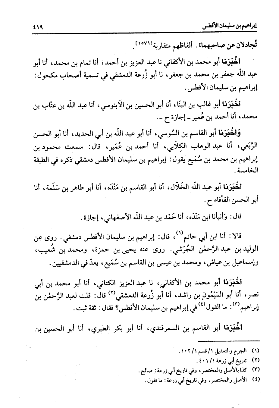 [1571] أخبرنا أبو محمد بن الأكفاني نا عبد العزيز بن أحمد أنا تمام بن محمد أنا أبو عبد الله جعفر بن محمد بن جعفر نا أبو زرعة الدمشقي في تسمية أصحاب مكحول إبراهيم بن سليمان الأفطس أخبرنا أبو غالب بن البنا أنا أبو الحسين بن الآبنوسي أنا عبد الله بن عتاب بن محمد أنا أحمد بن عيمر إجازة وأخبرنا أبو القاسم بن السوسي أنا أبو عبد الله بن أبي الحديد أنا أبو الحسن الربعي أنا عبد الوهاب الكلابي أنا أحمد بن عمير قال سمعت محمود بن إبراهيم بن محمد بن سميع يقول إبراهيم بن سليمان الأفطس دمشقي ذكره في الطبقة الخامسة أخبرنا أبو عبد الله الخلال أنا أبو القاسم بن منده أنا أبو طاهر بن سلمة أنا أبو الحسن الفأفاء ح قال وأنبأنا ابن منده أنا حمد بن عبد الله الأصفهاني إجازة قالا أنا ابن أبي حاتم (1) قال إبراهيم بن سليمان الأفطس دمشقي روى عن الوليد بن عبد الرحمن الجرشي روى عنه يحيى بن حمزة ومحمد بن شعيب وإسماعيل بن عياش ومحمد بن عيسى بن القاسم بن سميع يعد في الدمشقيين أخبرنا أبو محمد بن الأكفاني نا عبد العزيز الكتاني أنا أبو محمد بن أبي نصر أنا أبو الميمون بن راشد أنا أبو زرعة الدمشقي (2) قال قلت لعبد الرحمن بن إبراهيم (3) ما القول (4) في إبراهيم بن سليمان الأفط س فقال ثقة ثبت أخبرنا أبو القاسم بن السمرقندي أنا أبو بكر الطبري أنا أبو الحسين بن