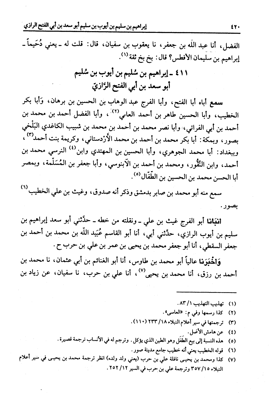 411 - إبراهيم بن سليم بن أيوب بن سليم أبو سعد بن أبي الفتح الرازي سمع أباه أبا الفتح وأبا الفرج عبد الوهاب بن الحسين بن برهان وأبا بكر الخطيب وأبا الحسين طاهر بن أحمد العابي (2) وأبا الفضل أحمد بن محمد بن أحمد بن أبي الفراتي وأبا نصر محمد بن أحمد بن محمد بن شبيب الكاغدي البلخي بصور وبمكة أبا بكر محمد بن أحمد بن محمد الأردستاني وكريمة بنت أحمد (3) وببغداد أبا محمد الجوهري وأبا الحسين بن المهتدي وابن (4) النرسي محمد بن أحمد وابن النقور ومحمد بن أحمد بن الآبنوسي وأبا جعفر بن المسلمة وبمصر أبا الحسن محمد بن الحسين بن الطفال (5) سمع منع أبو محمد بن صابر بدمشق وذكر أنه صدوق وغيث بن علي الخطيب (6) بصور أنبأنا أبو الفرج غيث بن علي ونقلته من خطه حدثني أبو سعد إبراهيم بن سليم بن أيوب الرازي حدثني أبي أنا أبو القاسم عبيد الله بن محمد بن أحمد بن جعفر السقطي أنا أبو جعفر محمد يحيى بن عمر بن علي بحرب ح وأخبرنا عاليا أبو محمد بن طاوس أنا أبو الغنائم بن أبي عثمان نا محمد بن أحمد بن رزق أنا محمد بن يحيى (7) أنا علي بن حرب نا سفيان عن زياد بن