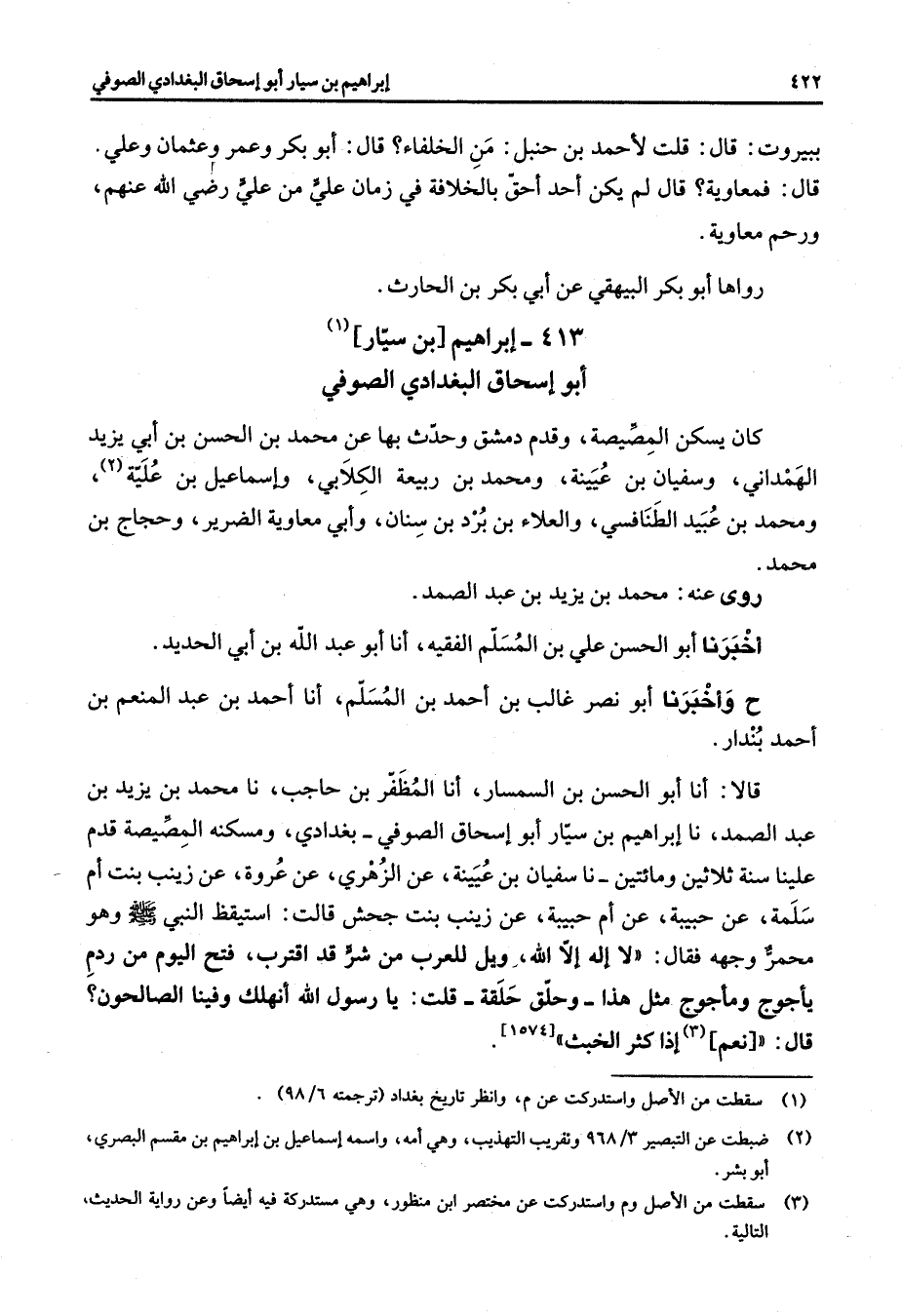 413 - إبراهيم بن سيار (1) أبو إسحاق البغدادي الصوفي كان يسكن المصيصة وقدم دمشق وحدث بها عن محمد بن الحسن بن أبي يزيد الهمداني وسفيان بن عيينة ومحمد بن ربيعة الكلابي وإسماعيل بن علية (2) ومحمد بن عبيد الطنافسي والعلاء بن بردبن سنان وأبي معاوية الضرير وحجاج بن محمد روى عنه محمد بن يزيد بن عبد الصمد أخبرنا أبو الحسن علي بن المسلم الفقيه أنا أبو عبد الله بن أبي الحديد ح وأخبرنا أبو نصر غالب بن أحمد بن المسلم أنا أحمد بن عبد المنعم بن أحمد بندار قالا أنا أبو الحسن بن السمسار أنا المظفر بن حاجب نا محمد بن يزيد بن عبد الصمد نا إبراهيم بن سيار أبو إسحاق الصوفي بغدادي ومسكنه المصيصة قدم علينا سنة ثلاثين ومائتين نا سفيان بن عيينة عن الزهري عن عروة عن زينب بنت أم سلمة عن حبيبة عن أم حبيبة عن زينب بنت جحش قال استيقظ النبي (صلى الله عليه وسلم) وهو محمر وجهه فقال لا إله إلا الله ويل للعرب من شر قد اقترب فتح اليوم من ردم يأجوج ومأجوج مثل هذا وحلق حلقة قلت يا رسول أنهلك وفينا الصالحون قال نعم (3) إذا كثر الخبث
