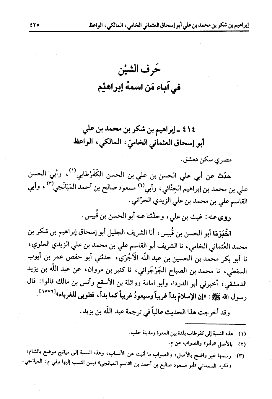 414 - إبراهيم بن شكر بن محمد بن علي أبو إسحاق العثماني الخامي المالكي الواعظ مصري سكن دمشق حدث عن أبي علي الحسن بن علي بن الحسن الكفر طابي (1) وأبي الحسن علي بن محمد بن إبراهيم الحنائي (2) وأبي مسعود صالح بن أحمد الميانجي (3) وأبي القاسم علي بن محمد بن علي الزيدي الحراني روى عنه غيث بن علي وحدثنا عنه أبو الحسن بن قبيس أخبرنا أبو الحسن بن قبيس أنا الشريف الجليل أبو إسحاق إبراهيم بن شكر بن محمد العثماني الخامي نا الشريف أبو القاسم علي بن محمد بن علي الزيدي العلوي نا أبو بكر محمد بن الحسين بن عبد الله الآجري حدثني أبو حفص عمر بن أيوب السقطي نا محمد بن الصباح الجرجرائي نا كثير بن مروان عن عبد الله بن يزيد الدمشقي أخبرني أبو الدرداء وأبو أمامة وواثلة بن الأسقع وأنس بن مالك قالوا قال رسول الله (صلى الله عليه وسلم) إن الإسلام بدأ غريبا وسيعود غريبا كما بدأ قطوبى للغرباء
