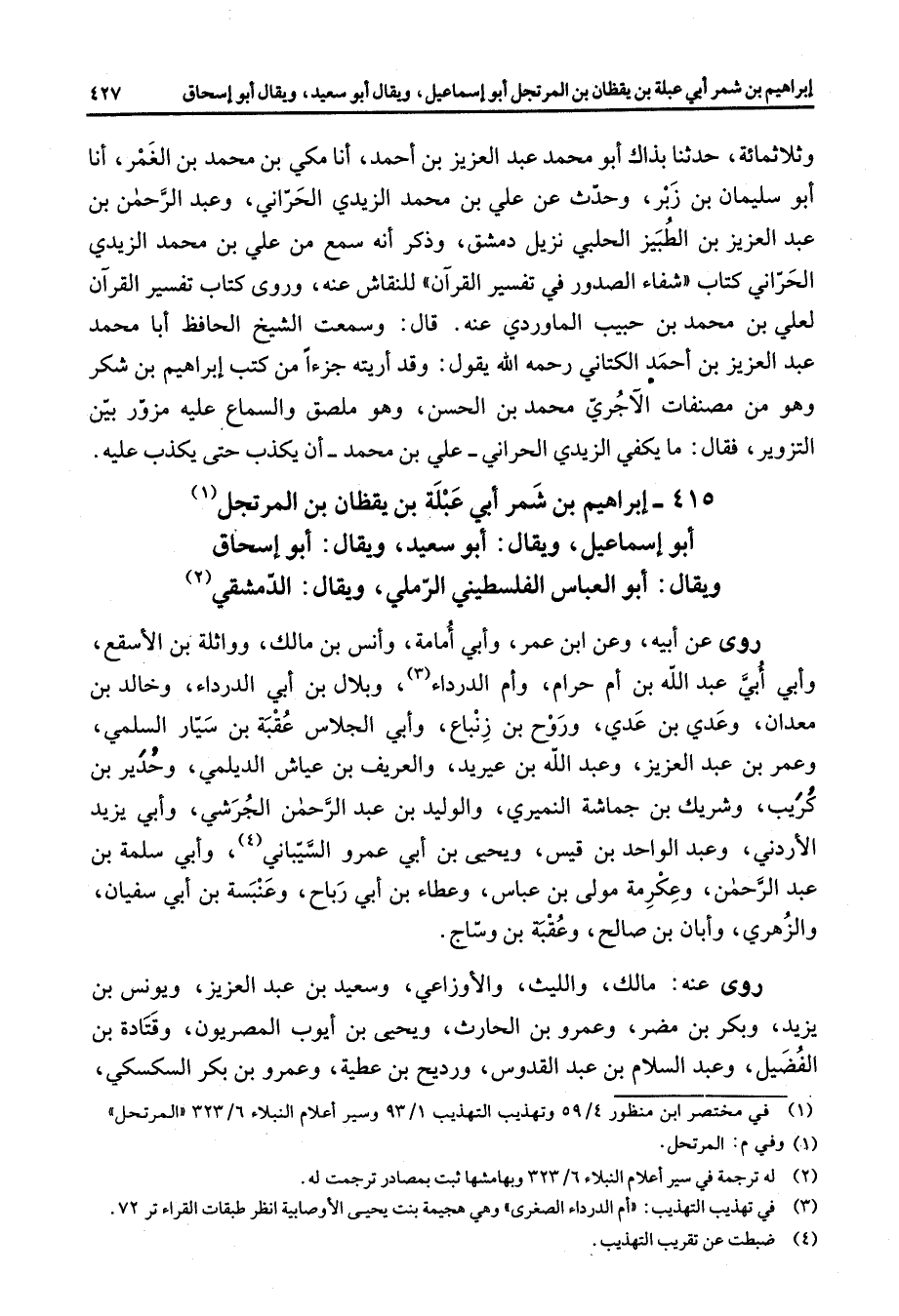 415 - إبراهيم بن شمر أبي عبلة بن يقظان بن المرتجل (1) أبو إسماعيل ويقال أبو سعيد ويقال أبو إسحاق ويقال أبو العباس الفلسطيني الرملي ويقال الدمشقي (2) روى عن أبيه وعن ابن عمر وأبي أمامة وأنس بن مالك وواثلة بن الأسقع وأبي أبي عبد الله بن أم حرام وأم الدرداء وبلال بن أبي الدرداء (3) وخالد بن معدان وعدي بن عدي وروح بن زنباع وأبي الجلاس عقبة بن سيار السلمي وعمر بن عبد العزيز وعبد الله بن عيريد والعريف بن عياش الديلمي وحدير بن كريب وشريك بن جماشة النميري والوليد بن عبد الرحمن الجرشي وأبي يزيد الأردني وعبد الواحد بن قيس ويحيى بن أبي عمرو السيباني (4) وأبي سلمة بن عبد الرحمن وعكرمة مولى بن عباس وعطاء بن أبي رباح وعنبسة بن أبي سفيان والزهري وأبان بن صالح وعقبة بن وساج روى عنه مالك والليث والأوزاعي وسعيد بن عبد العزيز ويونس بن يزيد وبكر بن مضر وعمرو بن الحارث ويحيى بن أيوب المصريون وقتادة بن الفضيل وعبد السلام بن عبد القدوس ورديح بن عطية وعمرو بن بكر السكسكي
