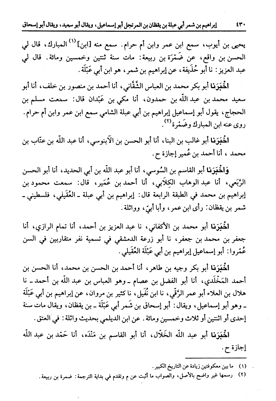 يحيى بن أيوب سمع ابن عمر وابن أم حرام سمع منه ابن (1) المبارك قال لي الحسن بن واقع عن ضمرة بن ربيعة مات سنة ثنتين وخمسين ومائة قال لي عبد العزيز نا أبو حذيفة عن إبراهيم بن شمر هو ابن أبي عبلة أخبرنا أبو بكر محمد بن العباس الشقاني أنا أحمد بن منصور بن خلف أنا أبو سعيد محمد بن عبد الله بن حمدون أنا مكي بن عبدان قال سمعت مسلم بن الحجاج يقول أبو إسماعيل إبراهيم بن أبي عبلة الشامي سمع ابن عمر وابن أم حرام روى عنه ابن المبارك وضمرة (2) أخبرنا أبو غالب بن البنا أنا أبو الحسن بن الآبنوسي أنا عبد الله بن عتاب بن محمد أنا أحمد بن عمير إجازة * * * *] وأخبرنا أبو القاسم بن السوسي أنا أبو عبد الله بن أبي الحديد أنا أبو الحسن الربعي أنا عبد الوهاب الكلابي أنا أحمد بن عمير قال سمعت محمود بن إبراهيم بن محمد في الطبقة الرابعة قال إبراهيم بن أبي عبلة العقيلي فلسطيني شمربن يقظان رأى ابن عمر وأبا أبي وواثلة أخبرنا أبو محمد بن الأكفاني نا عبد العزيز بن أحمد أنا تمام الرازي أنا جعفر بن محمد بن جعفر نا أبو زرعة الدمشقي في تسمية نفر متقاربين في السن عمروا أبو إسماعيل إبراهيم بن أبي عبلة العقيلي أخبرنا أبو بكر وجيه بن طاهر أنا أحمد بن الحسن بن محمد أنا الحسن بن أحمد المخلدي أنا أبو الفضل بن عصام وهو العباس بن عبد الله بن أحمد نا هلال بن العلاء أبو عمر الرقي نا ابن نفيل نا كثير بن مروان عن إبراهيم بن أبي عبلة وهو أبو إسماعيل ويقال أبو إسحاق بن شمر أبي عبلة بن يقظان ويقال مات سنة إحدى أو اثنتين أو ثلاث وخمسين ومائة عن ابن الديلمي بحديث واثلة في العتق أخبرنا أبو عبد الله الخلال أنا أبو القاسم بن منده أنا حمد بن عبد الله إجازة ح