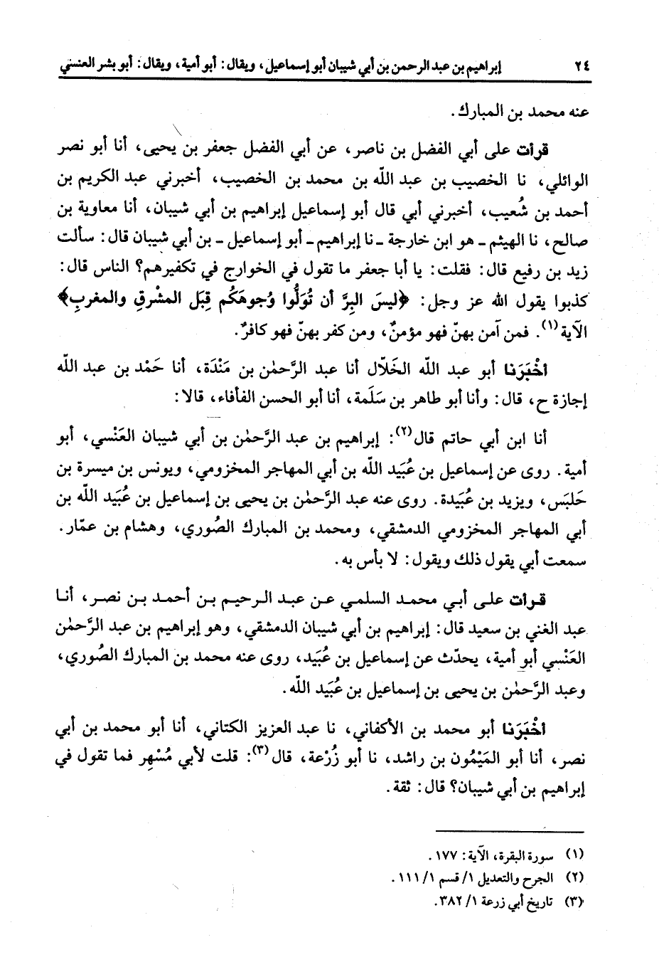عنه محمد بن المبارك قرأت على أبي الفضل بن ناصر عن أبي الفضل جعفر بن يحيى أنا أبو نصر الوائلي نا الخصيب بن عبد الله بن محمد بن الخصيب أخبرني عبد الكريم بن أحمد بن شعيب أخبرني أبي قال قال أبو إسماعيل إبراهيم بن أبي شيبان أنا معاوية بن صالح نا الهيثم هو ابن خارجة نا إبراهيم أبو إسماعيل بن أبي شيبان قال سألت زيد بن رفيع قال فقلت يا أبا جعفر ما تقول في الخوارج في تكفيرهم الناس قال كذبوا يقول الله عزوجل " ليس البر أن تولوا وجوهكم قبل المشرق والمغرب " الآية (1) فمن امن بهن فهو مؤمن ومن كفر بهن فهو كافر أخبرنا أبو عبد الله الخلال أنا عبد الرحمن بن مندة أنا حمد بن عبد الله إجازة قال وأنا أبو طاهر بن سلمة أنا أبو الحسن الفأفاء قالا أنا ابن أبي حاتم قال (2) إبراهيم بن عبد الرحمن بن أبي شيبان العنسي وأبو أمية روى عن إسماعيل بن عبيد الله بن أبي المهاجر المخزومي ويونس بن ميسرة بن حلبس ويزيد بن عبيدة روى عنه عبد الرحمن بن يحيى بن إسماعيل بن عبيد الله بن الله بن أبي المهاجر المخزومي الدمشقي ومحمد بن المبارك الصوري وهشام بن عمار سمعت أبي يقول ذلك ويقول لا بأس به قرأت على أبي محمد السلمي عن عبد الرحيم بن أحمد بن نصر أنا عبد الغني بن سعيد قال إبراهيم بن أبي شيبان الدمشقي وهو إبراهيم بن عبد الرحمن العنسي أبو أمية يحدث عن إسماعيل بن عبيد روى عنه محمد بن المبارك الصوري وعبد الرحمن بن يحيى بن إسماعيل بن عبيد الله أخبرنا أبو محمد بن الأكفاني نا عبد العزيز الكتاني أنا أبو محمد بن أبي نصر أنا أبو الميمون بن راشد نا أبو زرعة قال (3) قلت لأبي مسهر فما تقول في إبراهيم بن أبي شيبان قال ثقة