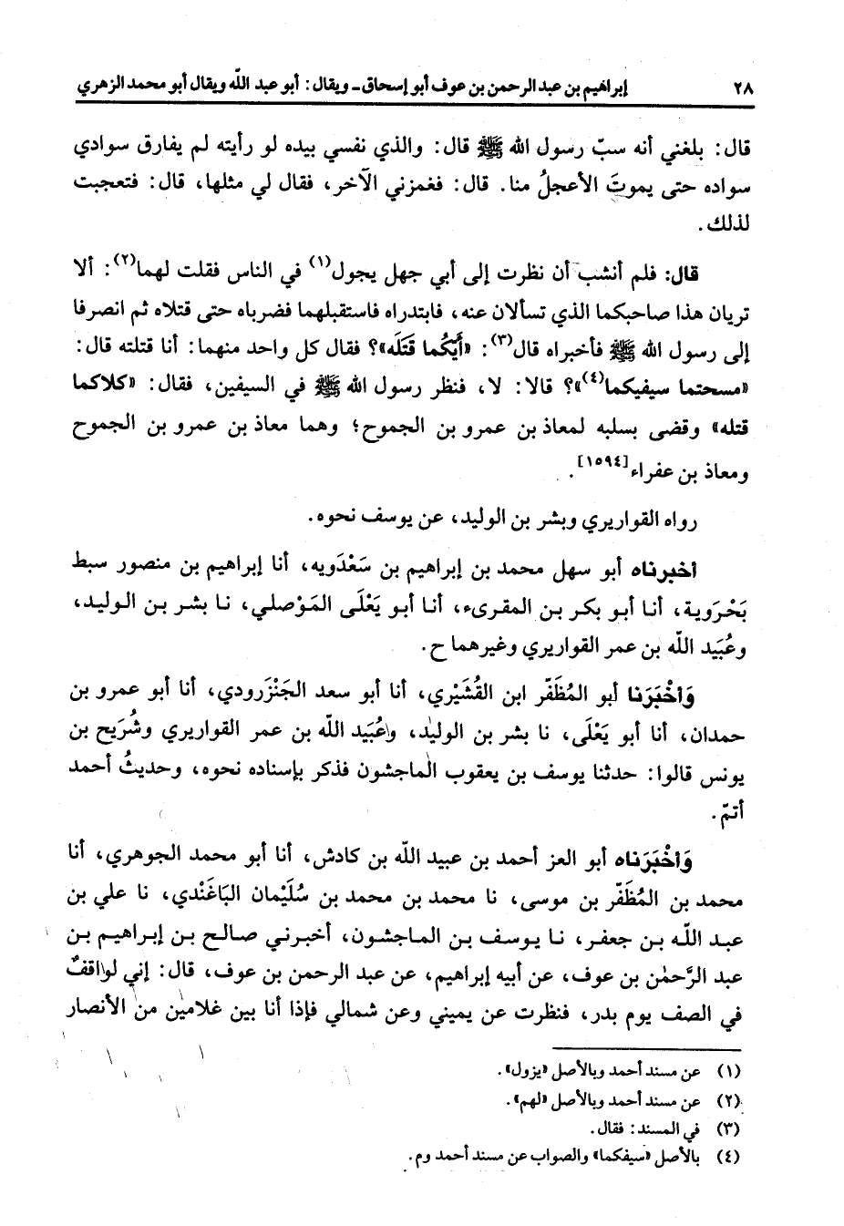 قال بلغني أنه سب رسول الله (صلى الله عليه وسلم) قال والذي نفسي بيده لو رأيته لم يفارق سوادي سواده حتى يموت الأعجل منا قال فغمزني الاخر فقال لي مثلها قال فتعجبت لذلك قال فلم أنشب أن نظرت إلى أبي جهل يجول (1) في الناس فقلت لهما (2) ألا تريان هذا صاحبكما الذي تسألان عنه فابتدراه فاستقبلهما فضرباه حتى قتلاه ثم انصرفا إلى رسول الله (صلى الله عليه وسلم) قال فأخبراه قال (3) (أيكما قتله) فقال كل واحد منهما أنا قتلته قال (مسحتما سيفكما (4)) قالا لا فنظر رسول الله (صلى الله عليه وسلم) في السيفين فقال (كلاكما قتله) وقضى بسلبه لمعاذ بن عمرو بن الجموح وهما معاذ بن عمرو بن الجموح ومعاذ بن عفراء رواه القواريري وبشر بن الوليد عن يوسف نحوه أخبرناه أبو سهل محمد بن إبراهيم بن سعدويه أنا إبراهيم بن منصور سبط بحروية أنا أبو بكر بن المقرئ أنا أبو يعلى الموصلي نا بشر بن الوليد وعبيد الله بن عمر القواريري وغيرهما وأخبرنا أبو المظفر ابن القشيري أنا أبو سعد الجنزرودي أنا أبو عمرو بن حمدان أنا أبو يعلى نا بشر بن الوليد وعبيد الله بن عمر القواريري وشريح بن يونس قالوا حدثنا يوسف بن يعقوب الماجشون فذكر بإسناده نحوه وحديث أحمد أتم وأخبرناه أبو العز أحمد بن عبيد الله بن كادش أنا أبو محمد الجوهري أنا محمد بن المظفر بن موسى نا محمد بن محمد بن سليمان الباغندي نا علي بن عبد الله بن جعفر نا يوسف بن الماجشون أخبرني صالح بن إبراهيم بن عبد الرحمن بن عوف عن أبيه إبراهيم عن عبد الرحمن بن عوف قال إني لواقف في الصف يوم بدر فنظرت عن يميني وعن شمالي فإذا أنا بين غلامين من الأنصار