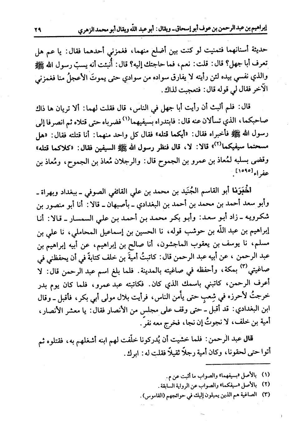 حديثة أسنانهما فتمنيت لو كنت بين أضلع منهما فغمزني أحدهما فقال يا عم هل تعرف أبا جهل قال قلت نعم فما حاجتك إليه قال أنبئت أنه يسب رسول الله (صلى الله عليه وسلم) والذي نفسي بيده لئن رأيته لا يفارق سواده من سوادي حتى يموت الأعجل منا فغمزني الاخر فقال لي قوله قال فتعجبت لذاك قال فلم ألبث أن رأيت أبا جهل في الناس قال فقلت لهما ألا تريان ها ذاك صاحبكما الذي تسألان عنه قال فابتدراه بسيفهما (1) فضرباه حتى قتلاه ثم أنصرفا إلى رسول الله (صلى الله عليه وسلم) فأخبراه فقال (أيكما قتله) فقال كل واحد منهما أنا قتلته فقال (هل مسحتما سيفيكما (2)) [*] قالا لا قال فنظر رسول الله (صلى الله عليه وسلم) السيفين فقال (كلاكما قتله) وقضى بسلبه لمعاذ بن عمرو بن الجموح قال والرجلان معاذ بن الجموح ومعاذ بن عفراء أخبرنا أبو القاسم الجنيد بن محمد بن علي القائفي الصوفي ببغداد وبهراة وأبو سعد أحمد بن محمد بن أحمد بن البغدادي بأصبهان قالا أنا أبو منصور بن شكرويه زاد أبو سعد وأبو بكر محمد بن أحمد بن علي السمسار قالا أنا إبراهيم بن عبد الله بن حوشب قوله نا الحسين بن إسماعيل المحاملي نا علي بن مسلم نا يوسف بن يعقوب الماجشون أنا صالح بن إبراهيم عن أبيه إبراهيم بن عبد الرحمن عن أبيه عبد الرحمن قال كاتبت أمية بن خلف كتابة في أن يحفظني في صاغيتي (3) بمكة واحفظه في صاغيته بالمدينة فلما بلغ اسم عبد الرحمن قال لا أعرف الرحمن كاتبني باسمك الذي كان فكاتبته عبد عمرو فلما كان يوم بدر خرجت لأحرزه في شعب حتى يأمن الناس فرأيت بلال مولى أبي بكر فأقبل وقال ابن البغدادي قد أقبل حتى وقف على مجلس من الأنصار فقال يا معشر الأنصار أمية بن خلف لا نجوت إن نجا فخرج معه نفر قال عبد الرحمن فلما خشيت أن يدركونا خلفت لهم ابنه أشغلهم به فقتلوه ثم أتوا حتى لحقونا وكان أمية رجل ثقيلا فقلت له ابرك