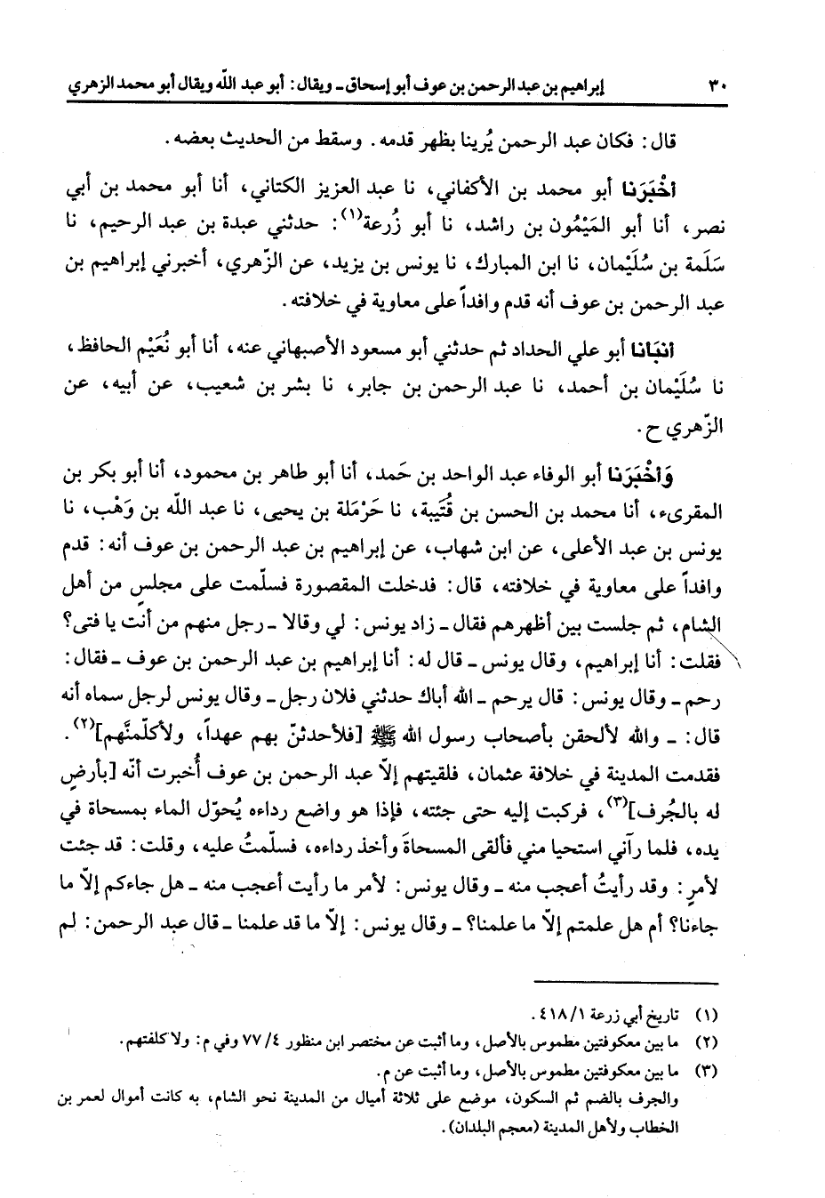 قال فكان عبد الرحمن يرينا بظهر قدمه وسقط من الحديث بعضه أخبرنا أبو محمد بن الأكفاني نا عبد العزيز الكتاني أنا أبو محمد بن أبي نصر أنا أبو الميمون بن راشد نا أبو زرعة (1) حدثني عبدة بن عبد الرحيم نا سلمة بن سليمان نا ابن المبارك نا يونس بن يزيد عن الزهري أخبرني إبراهيم بن عبد الرحمن بن عوف أنه قدم وافدا على معاوية في خلافته أنبأنا أبو علي الحداد ثم حدثني أبو مسعود الاصبهاني عنه أنا أبو نعيم الحافظ نا سليمان بن أحمد نا عبد الرحمن بن جابر نا بشر بن شعيب عن أبيه عن الزهري وأخبرنا أبو الوفاء عبد الواحد بن حمد أنا أبو طاهر بن محمود أنا أبو بكر بن المقرئ أنا محمد بن الحسن بن قتيبة نا حرملة بن يحيى نا عبد الله بن وهب نا يونس بن عبد الأعلى عن ابن شهاب عن إبراهيم بن عبد الرحمن بن عوف أنه قدم وافدا على معاوية في خلافته قال فدخلت المقصورة فسلمت على مجلس من أهل الشام ثم جلست بين أظهرهم فقال زاد يونس لي وقالا رجل منهم من أنت يا فتى فقلت أنا إبراهيم وقال يونس قال له أنا إبراهيم بن عبد الرحمن بن عوف فقال رحم وقال يونس قال يرحم الله أباك حدثني فلان رجل وقال يونس لرجل سماه أنه قال والله لألحقن بأصحاب رسول الله (صلى الله عليه وسلم) فلأحدثن بهم عهدا ولأكلمنهم (2) فقدمت المدينة في خلافة عثمان فلقيتهم إلا عبد الرحمن بن عوف أخبرت أنه بأرض له بالجرف (3) فركبت إليه حتى جئته فإذا هو واضع رداءه يحول الماء بمسحاة في يده فلما راني استحيا مني فألقى المسحاة وأخذ رداءه فسلمت عليه وقلت قد جئت لأمر وقد رأيت أعجب منه وقال يونس لأمر ما رأيت أعجب منه هل جاءكم إلا ما جاءنا أم هل علمتم إلا ما علمنا وقال يونس إلا ما قد علمنا قال عبد الرحمن لم